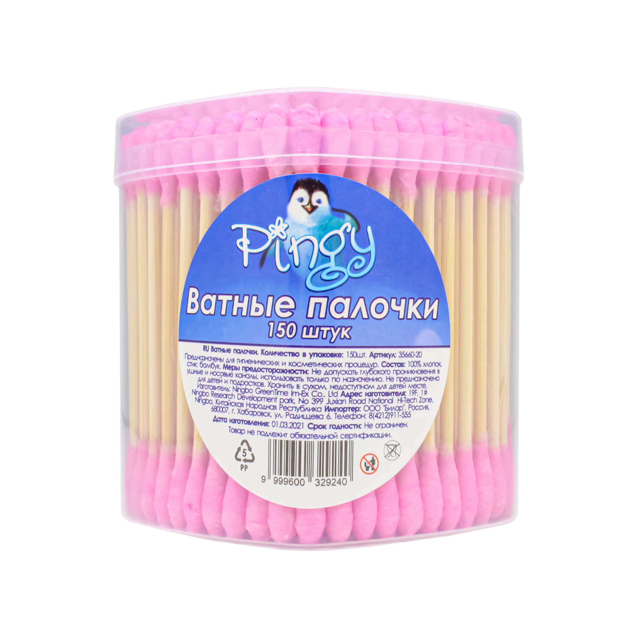 Pingy Ватные палочки 150 шт. изготовлены из прочного экологически чистого бамбука, на который крепко намотан нежный органический хлопок, и он не пушится. Бамбуковые ватные палочки гиппоаллергенны, не содержат синтетических отдушек. Подходят для ежедневного использования в косметических целях, выполнения гигиенических процедур, ухода за детьми, а также животными.