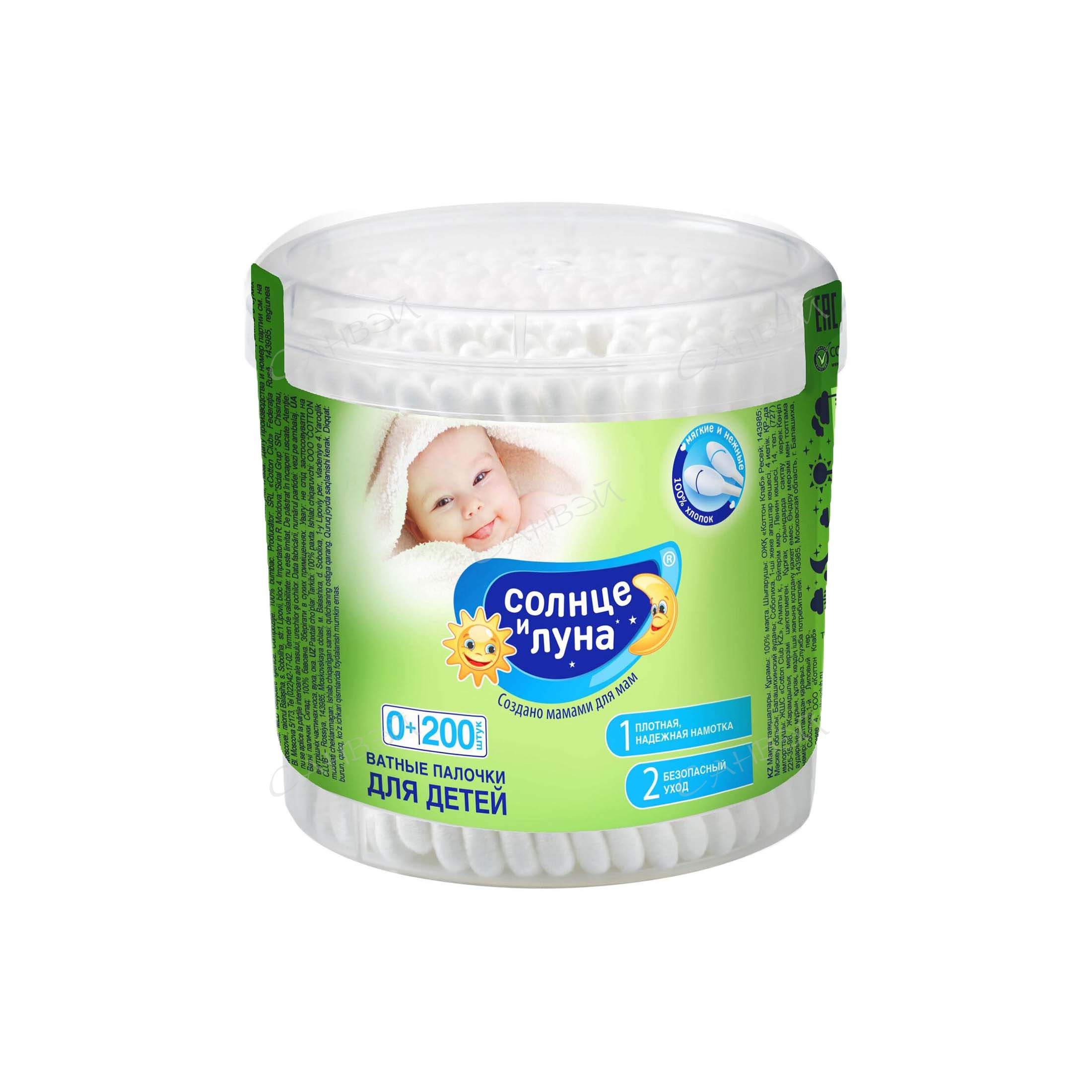 Солнце и Луна Ватные палочки200 шт. Натуральные палочки из 100% хлопка идеально подходят для гигиены самых маленьких. Плотная и надежная намотка ватных палочек обеспечивает безопасный и удобный уход за малышом. Отлично впитывают влагу, не оставляют ворсинок на коже малыша, безопасный и надежный уход благодаря натуральному материалу.
