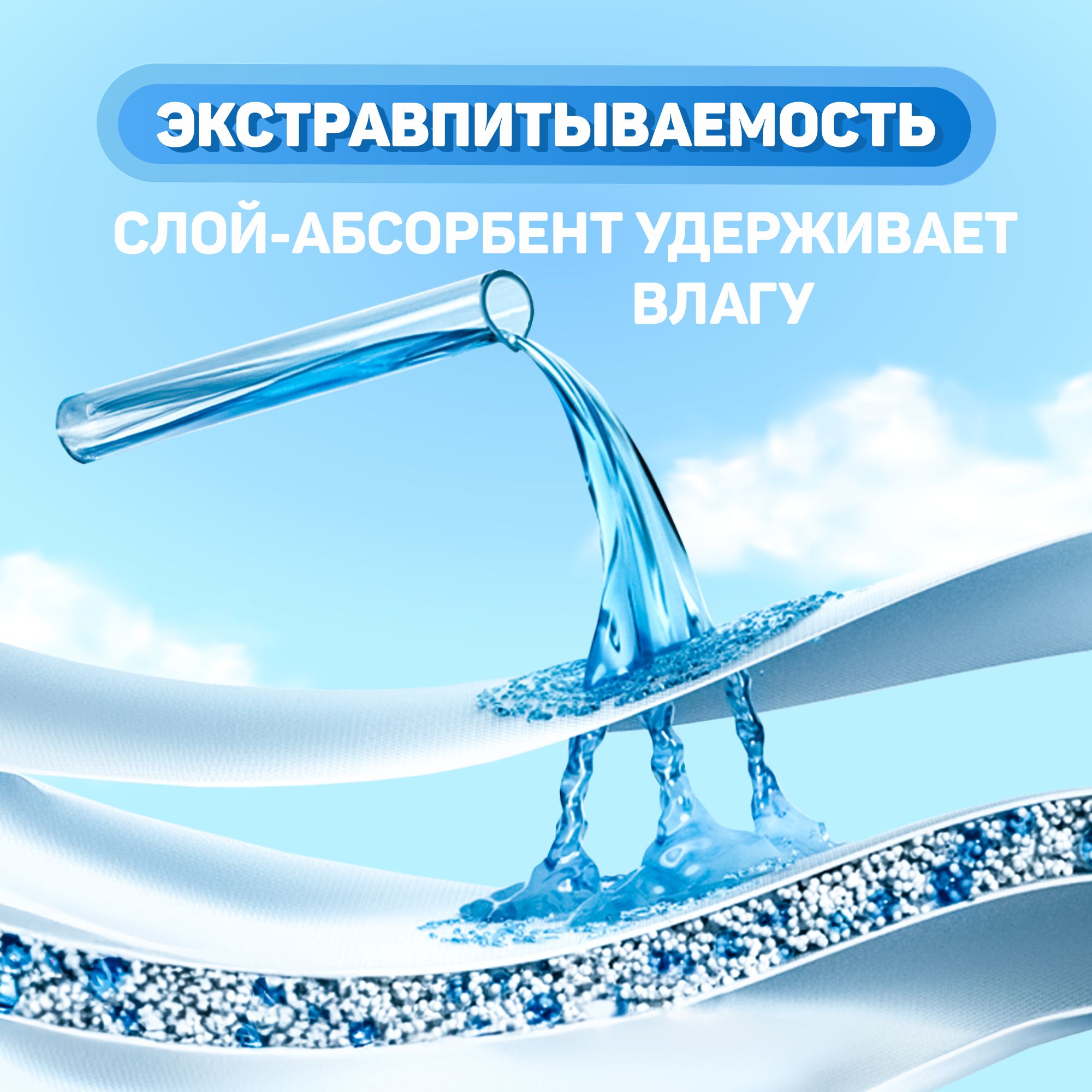- Прокладка быстро и полностью впитывает влагу и запирает ее внутри абсорбирующего слоя, оставляя ощущение сухости и комфорта.