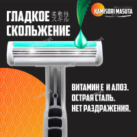 Kamisori Masuta Бритвенный станок одноразовый 3 лезвия 1 шт является качественным и безопасным бритвенным станком. Произведен с использованием инновационных методов, разработок и современного оборудования. Технология покрытия лезвия, использование в составах тефлона и хрома позволяет использовать каждый станок не переживая за качество бритья. Качественное тефлоновое покрытие и специальная смазывающая полоска с алоэ и витамином Е обеспечивает безопасность и легкое скольжение бритвы по коже. Эргономичность ручки в сочетании с правильным углом наклона обеспечивает комфорт в использовании бритвенного станка.