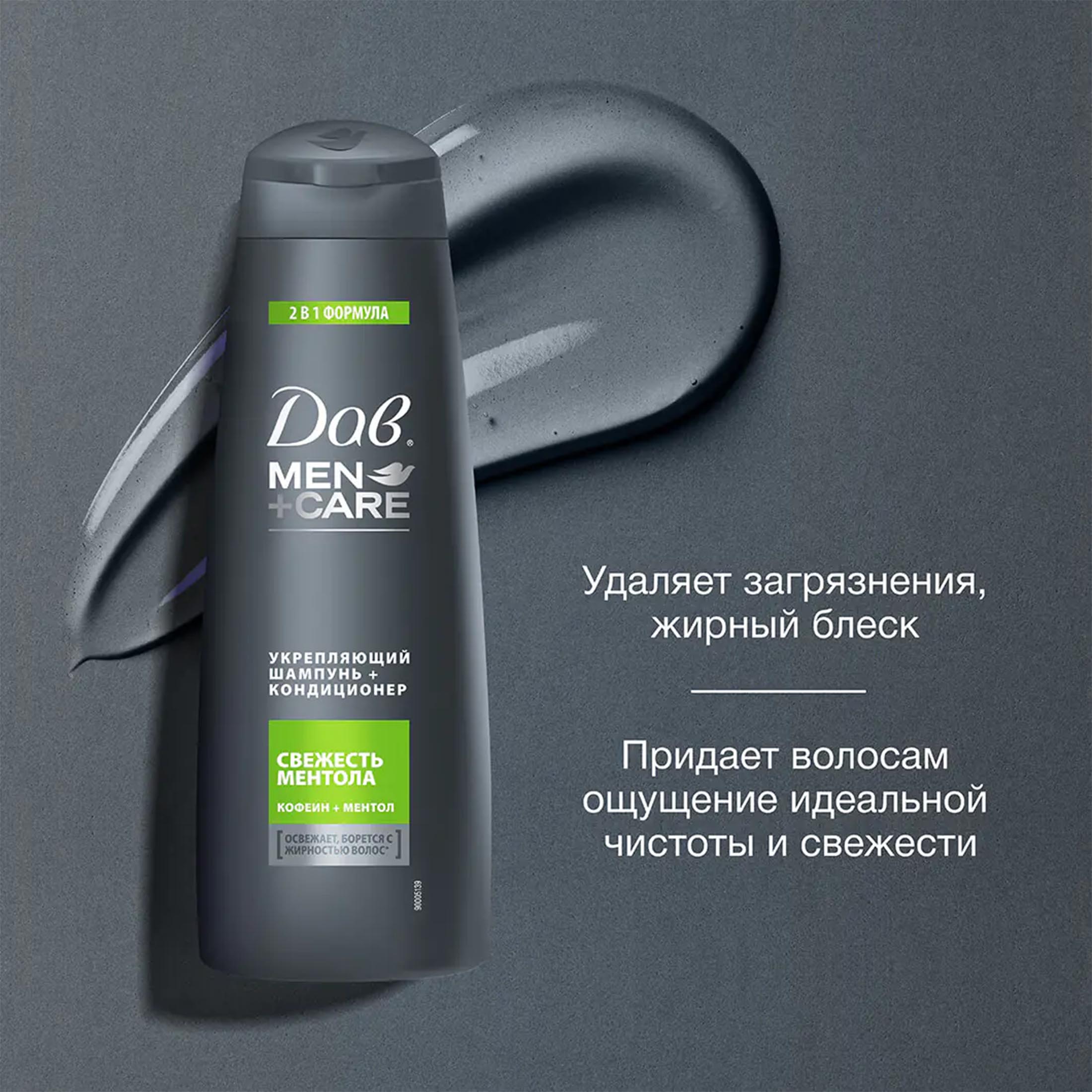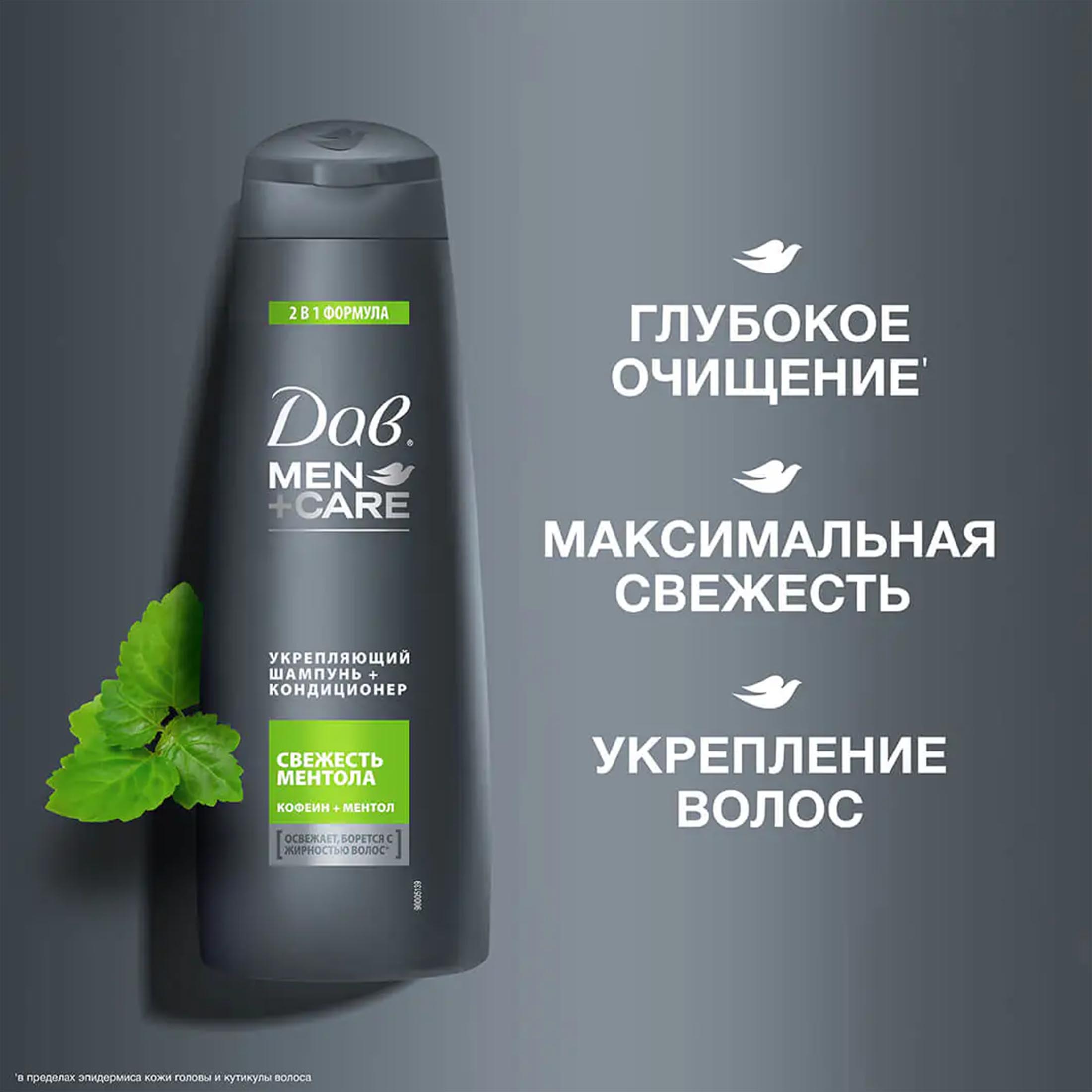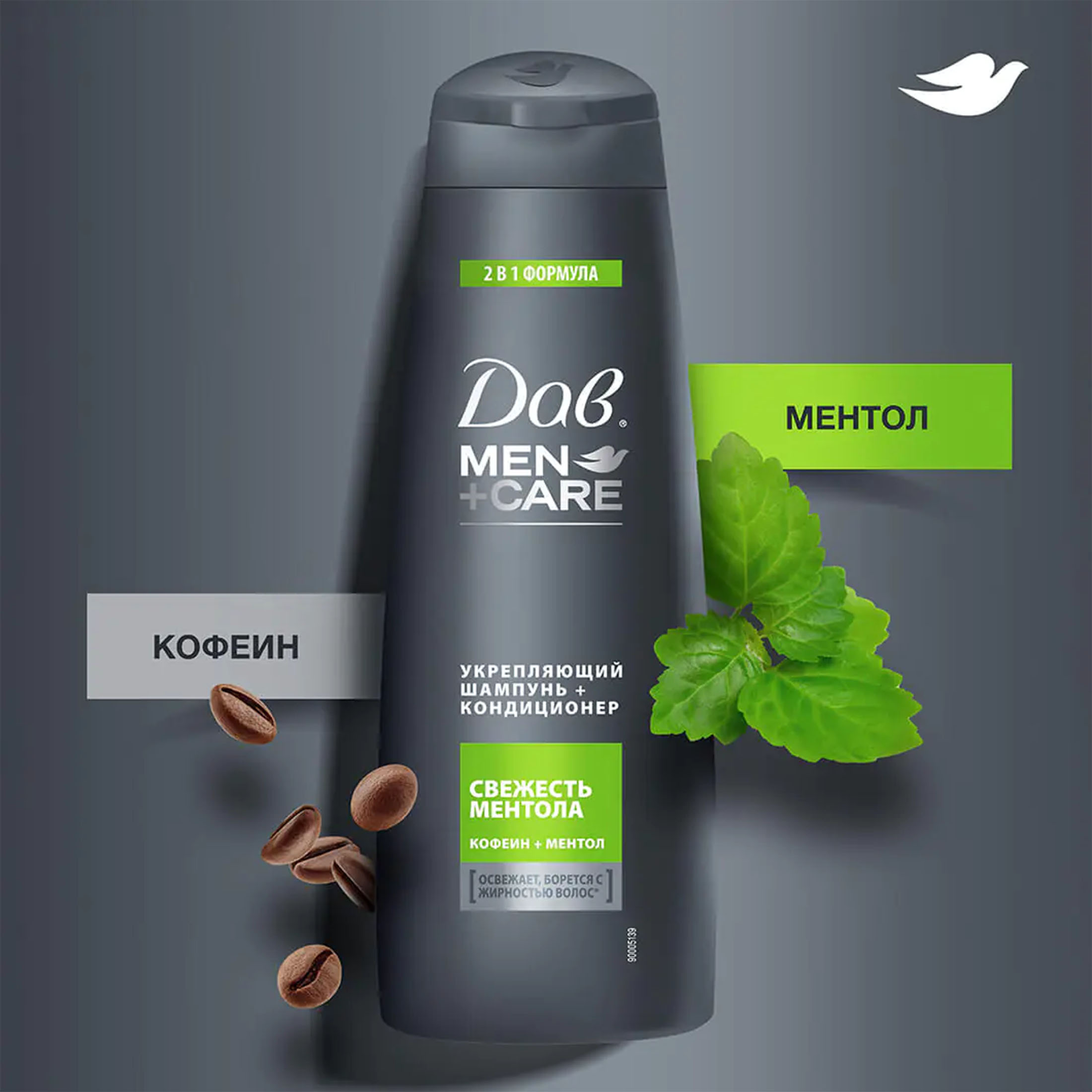 Мужской шампунь-кондиционер Дав Men+Care Свежесть Ментола разработан специально для борьбы с жирностью волос. Средство придает волосам здоровый свежий вид, наполняет их силой и блеском. Шампунь 2в1 Дав Men+Care создано по умной формуле, в которой шампунь отвечает за глубокое очищение* волос от корней до самых кончиков, а кондиционирующие компоненты делают их более послушными и блестящими.При регулярном использовании средства волосы наполняются энергией приобретают естественный блеск. Шампунь для волос для мужчин Дав Men+Care подходит для ежедневного применения.