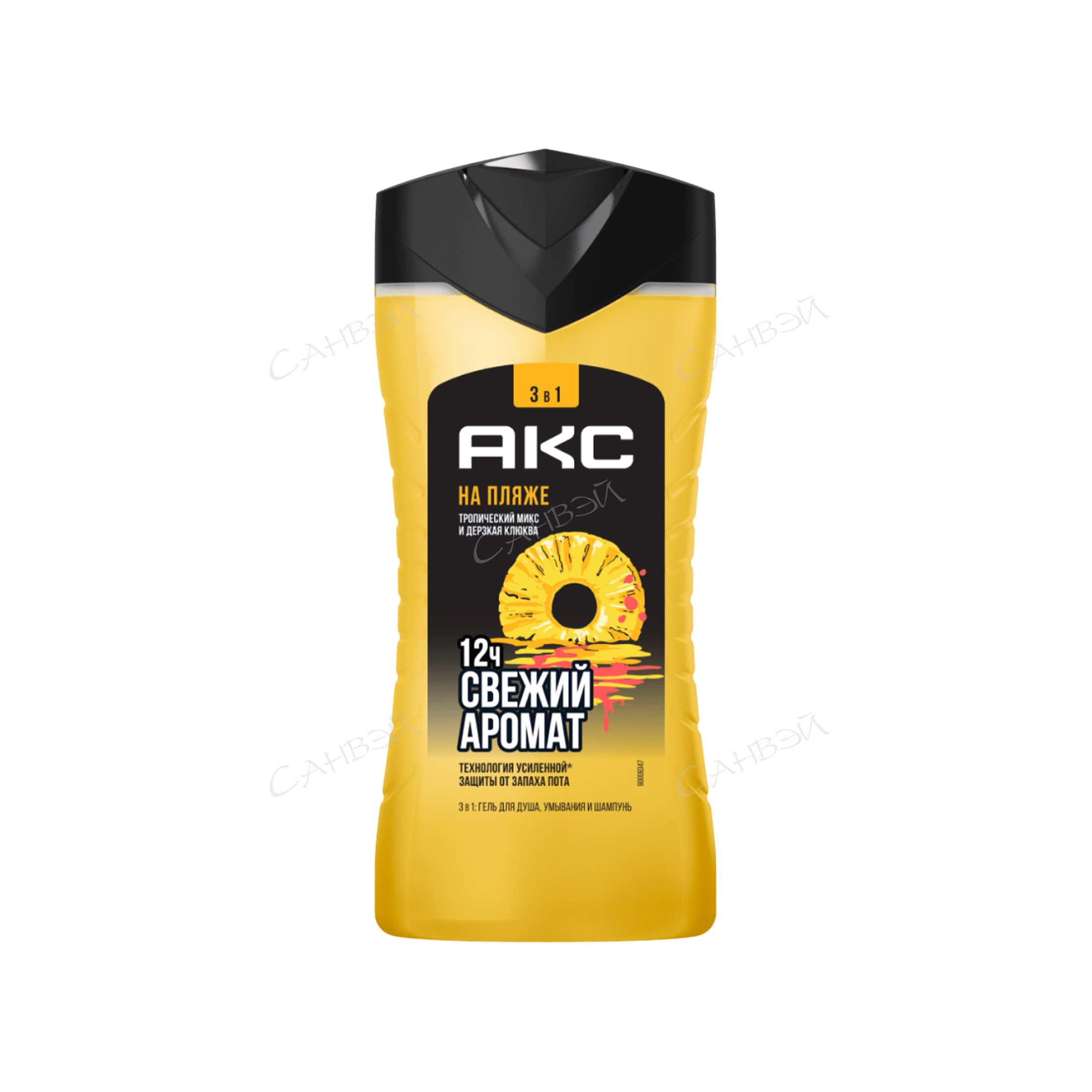 Акс Гель для душа 3в1 На пляже 250 мл одинаково хорош как шампунь для волос, средство для умывания лица и гель для душа. Средство имеет яркий фруктовый аромат, на создание которого вдохновил известный хит популярный тропический коктейль. Притягательные ноты клюквы, сочного ананаса и яркого апельсина передали новому аромату Акс свой страстный характер. Гель для душа 3в1 мужской разработан на основе технологии усиленной защиты от запаха пота на протяжении 12 часов.