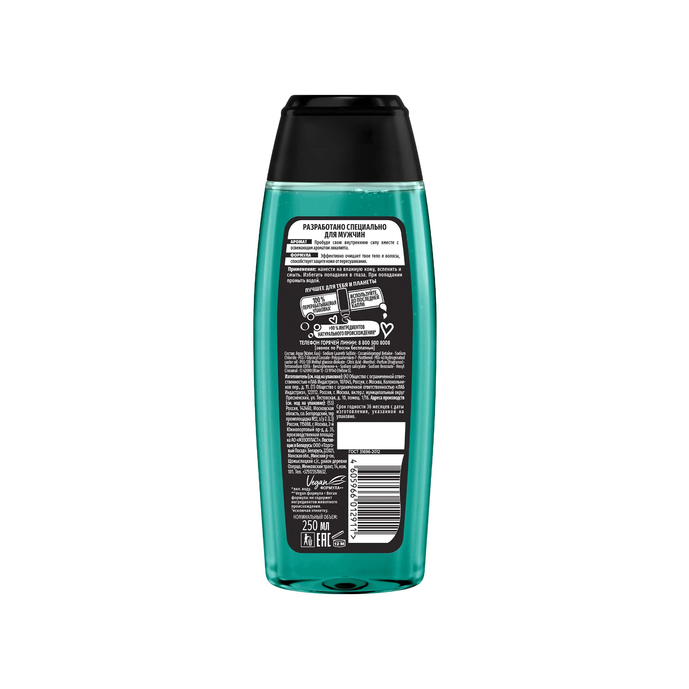 Пробуди свою внутреннюю силу вместе с освежающим ароматом эвкалипта. Эффективно очищает твое тело и волосы, способствует защите кожи от пересушивания. Разработано специально для мужчин.