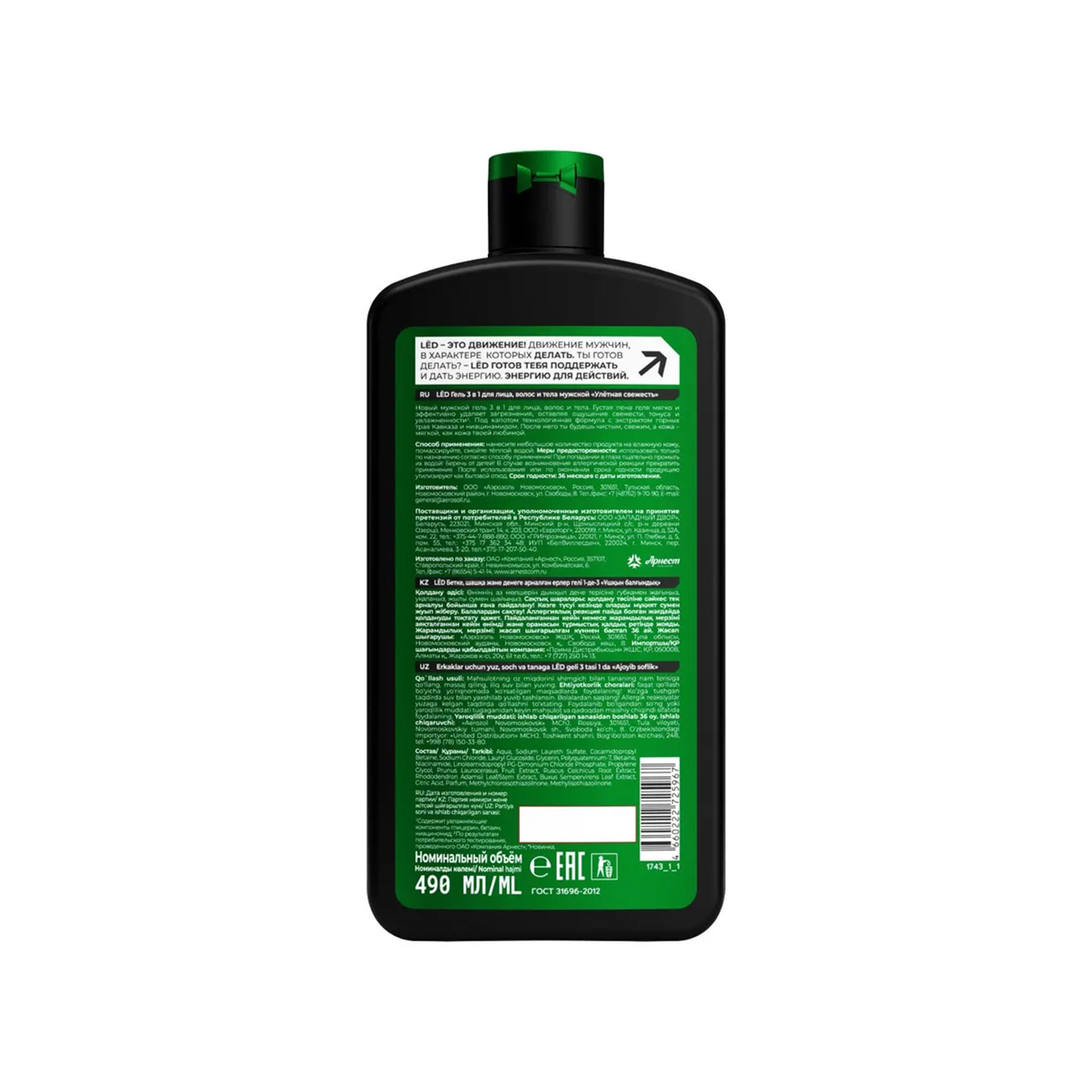 LЁD Гель для душа Улетная свежесть 3 в 1 490 мл - это универсальное средство, которое сочетает в себе функции геля для душа и мужского шампуня, обеспечивая комплексный уход. Благодаря уникальной формуле, он подходит для ежедневного использования и бережно очищает, тонизирует и увлажняет, будто вы только что окунулись в прохладные воды горного ручья.