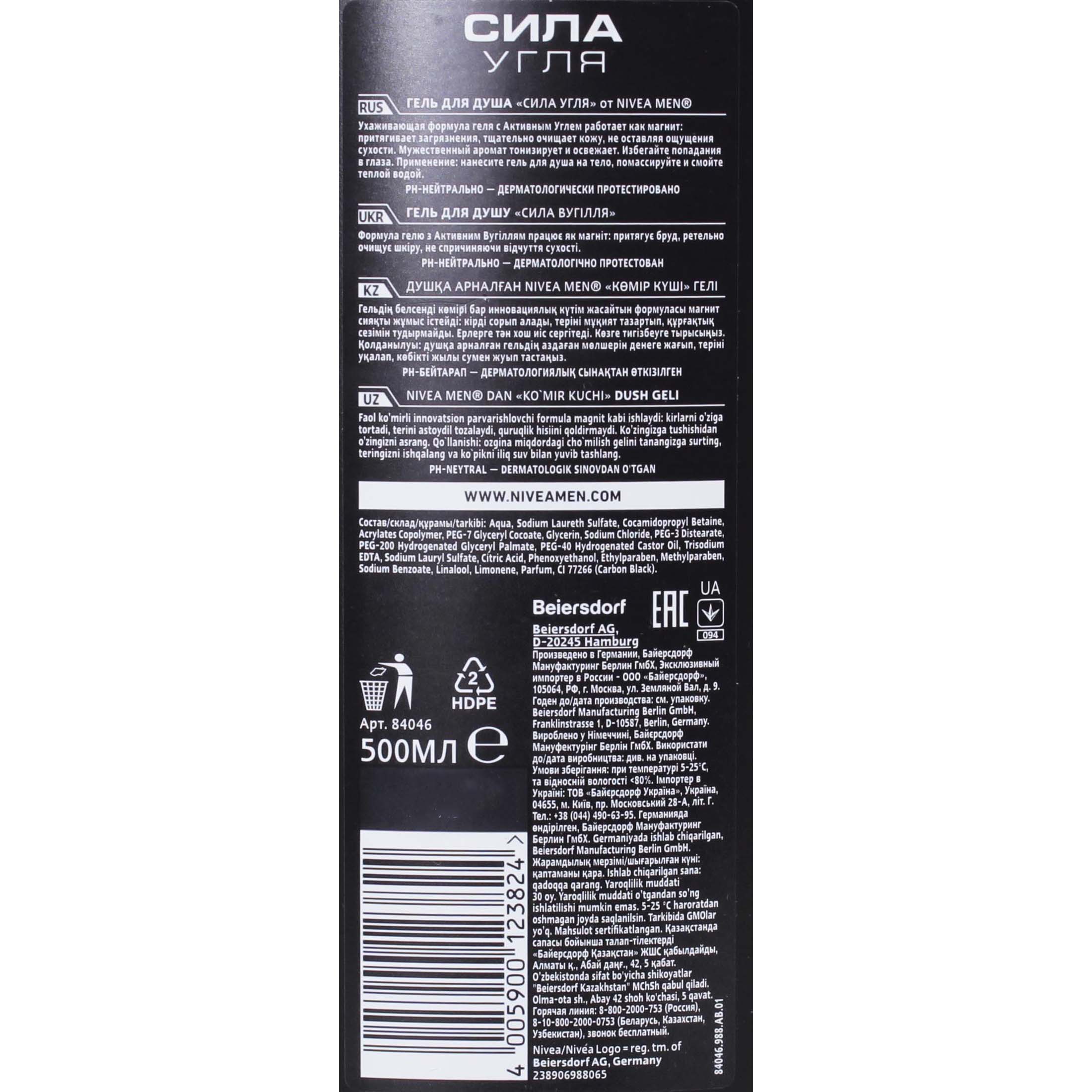 Nivea Сила угля гель д/душа 500мл муж увлаж.,питание д/в тип.кожи свеж. флакон 1шт / 12шт / 84046 / 123824