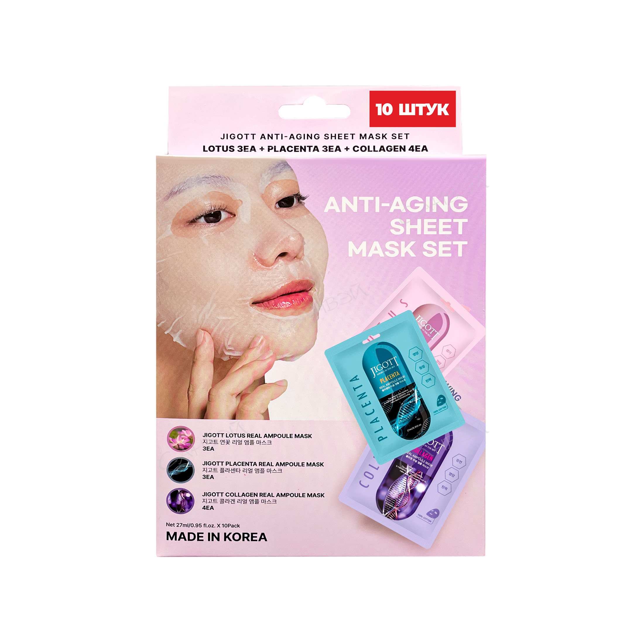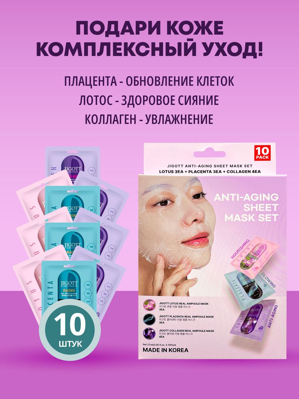 Jigott Набор 10пр. маска ткан.д/лица (3шт*лотос+3шт*экст.плценты+4шт коллаген) д/в т.кожи 1уп. / 60шт / JT-53 / 283550