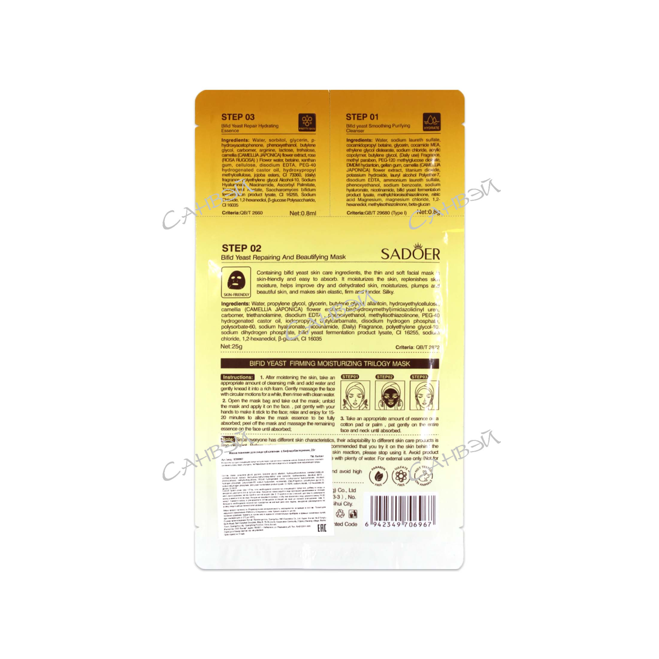 Маска тканевая для лица трёхэтапная с бифидобактериями, 25г - в комплекс входит очищающее средство для лица, сыворотка и тканевая маска. Данный комплекс поможет увлажнить кожу лица, улучшить ее барьерные свойства и защитить от воздействий окружающей среды.