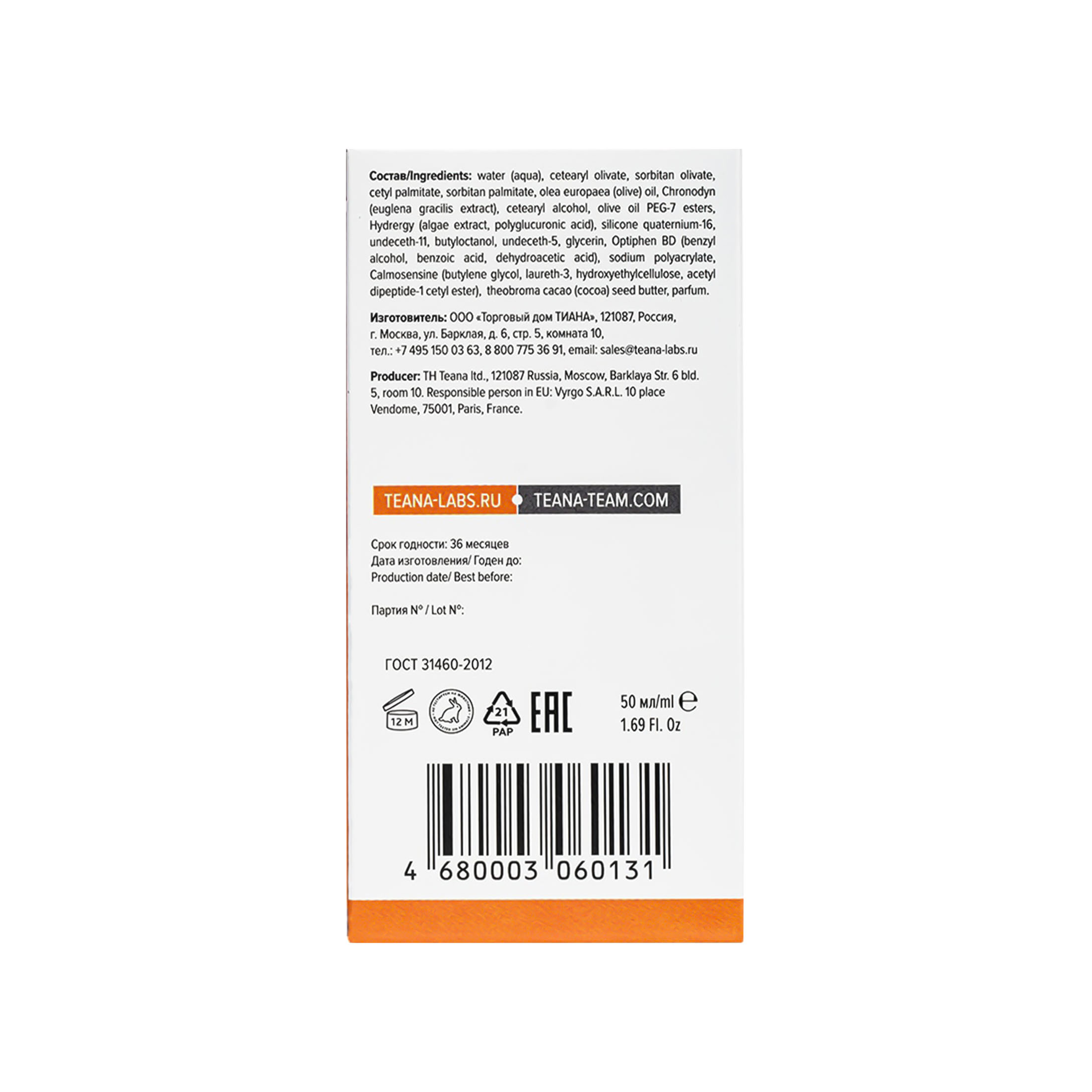 water (aqua), cetearyl olivate (and) sorbitan olivate, cetyl palmitate (and) sorbitan palmitate, olea europaea (olive) oil, Chronodyn (euglena gracilis extract), cetearyl alcohol, olive oil PEG-7 esters, Hydrergy (algae extract, polyglucuronic acid), silicone quaternium-16 (and) undeceth-11 (and) butyloctanol (and) undeceth-5, glycerin, Optiphen BD (benzyl alcohol, benzoic acid, dehydroacetic acid), sodium polyacrylate, Calmosensine (butylene glycol, laureth-3, hydroxyethylcellulose, acetyl dipeptide-1 cetyl ester), theobroma cacao (cocoa) seed butter, parfum.