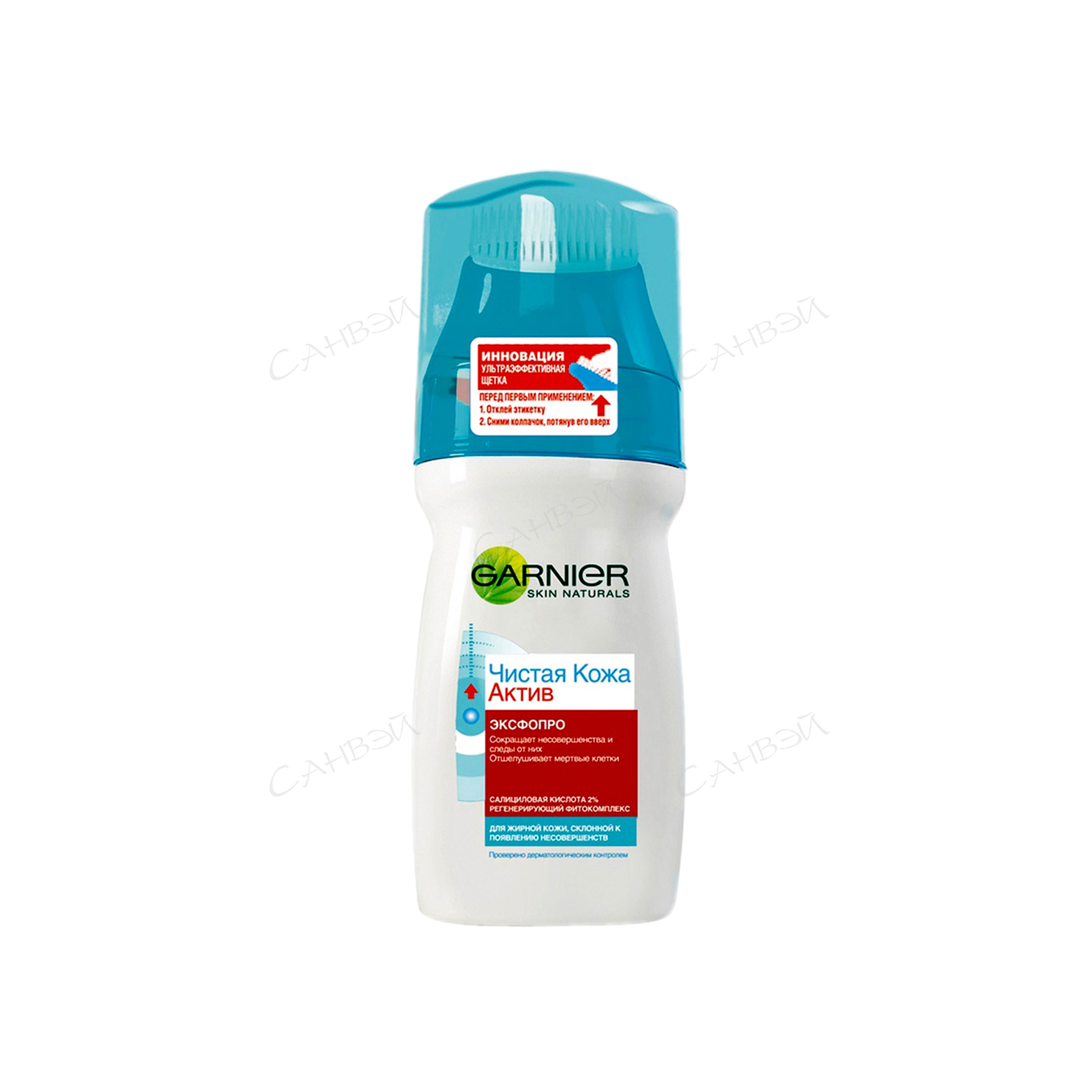 Намочите лицо. Снимите крышку и поверните насадку. Намочите щетинки и наклоните флакон вниз, слегка придавите, чтобы средство вышло. Верните насадку в исходное положение. Наносите средство круговыми движениями с помощью насадки со щетинками. Тщательно смойте.