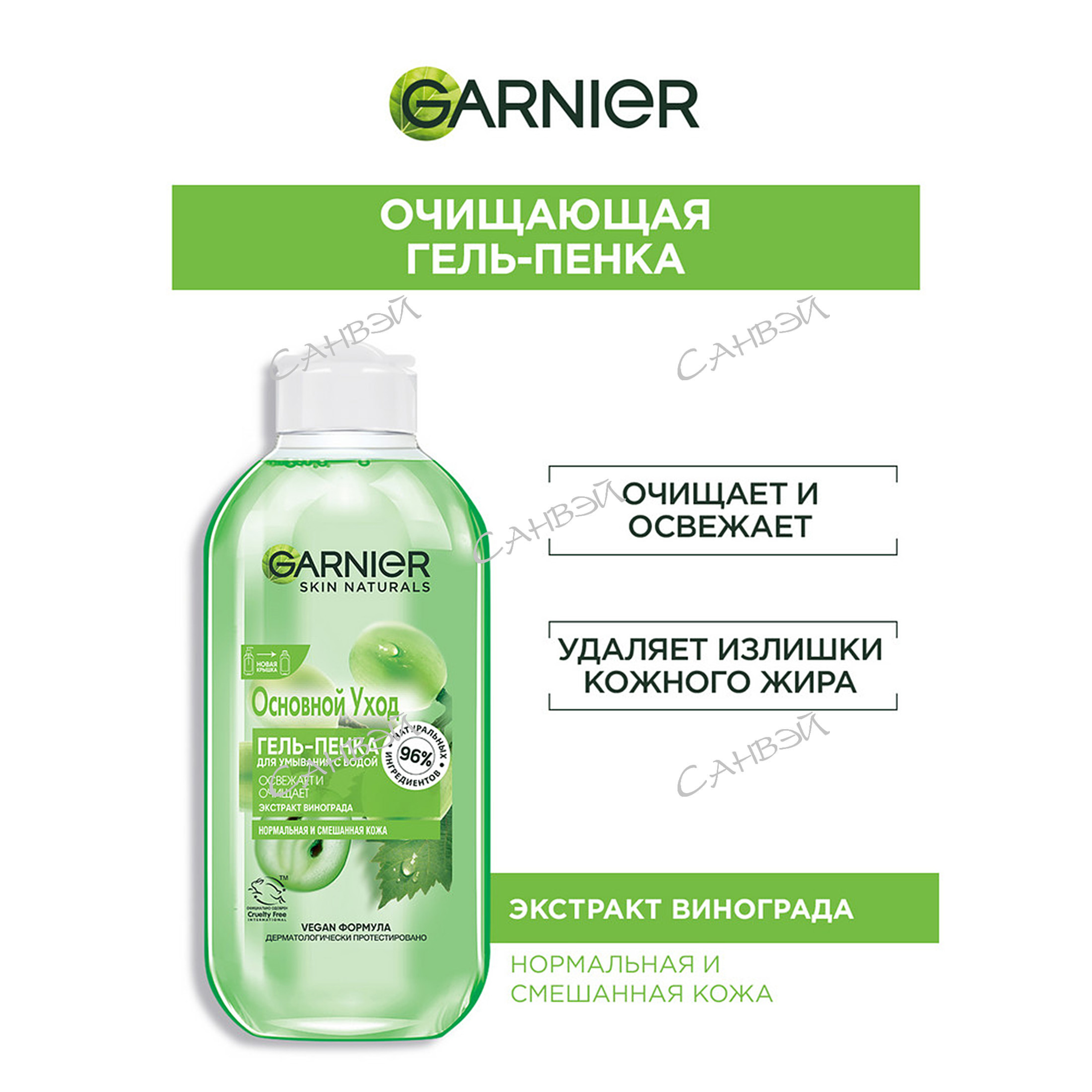 Garnier Гель-пенка для лица Основной уход, Экстракт винограда, очищающий, для нормальной и смешанной кожи, 200 мл на 96% состоит из ингредиентов натурального происхождения.