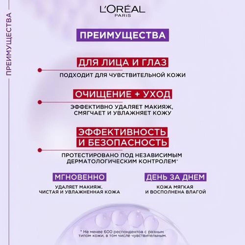 - Благодаря мицеллам, захватывающим загрязнения, мгновенно удаляет макияж, кожа становится чистой и увлажнённой. День за днем кожа мягкая и восполненная влагой.
