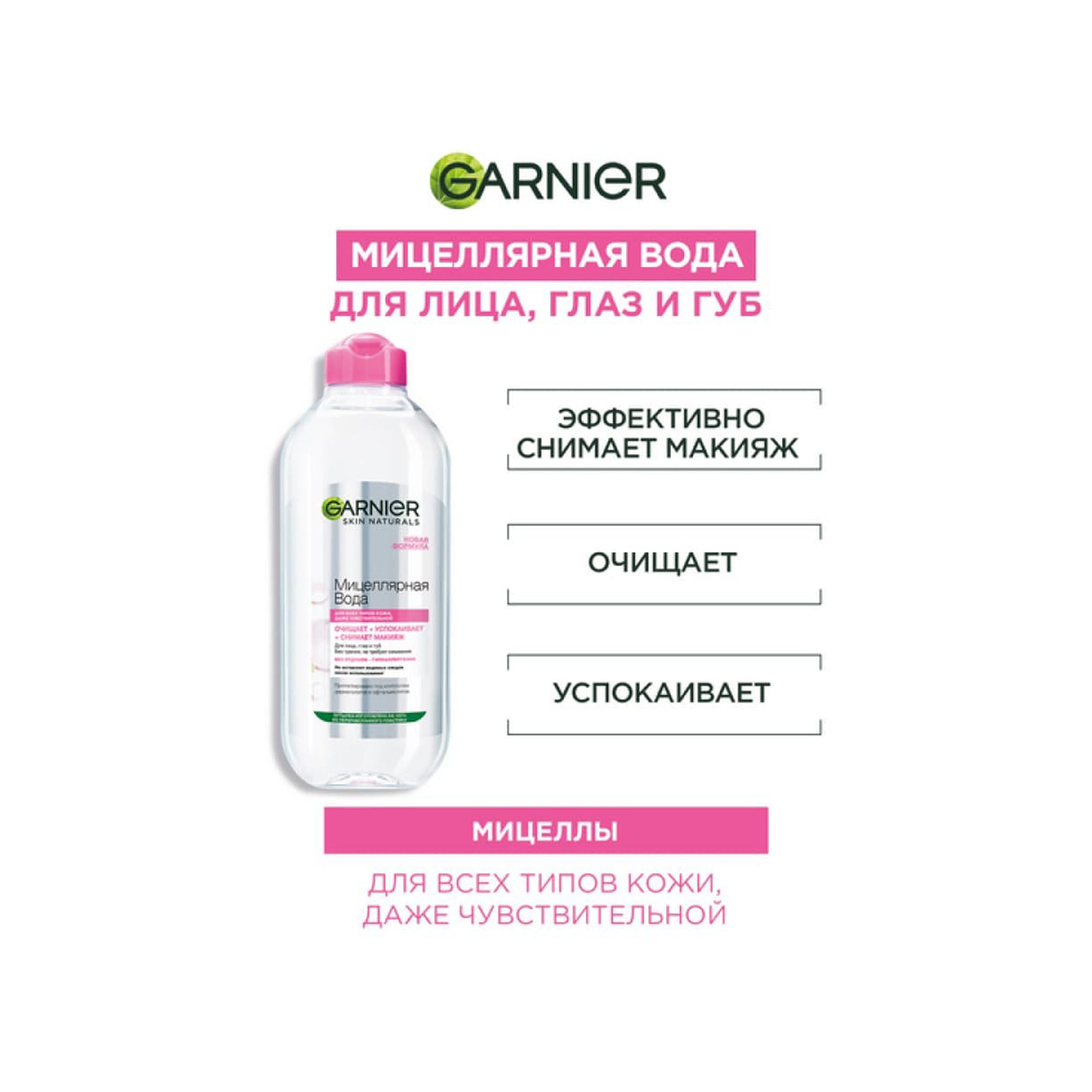 - Мицеллы захватывают и бережно удаляют загрязнения, излишки себума и косметику с поверхности лица, глаз и губ, оставляя кожу идеально чистой с первого применения.