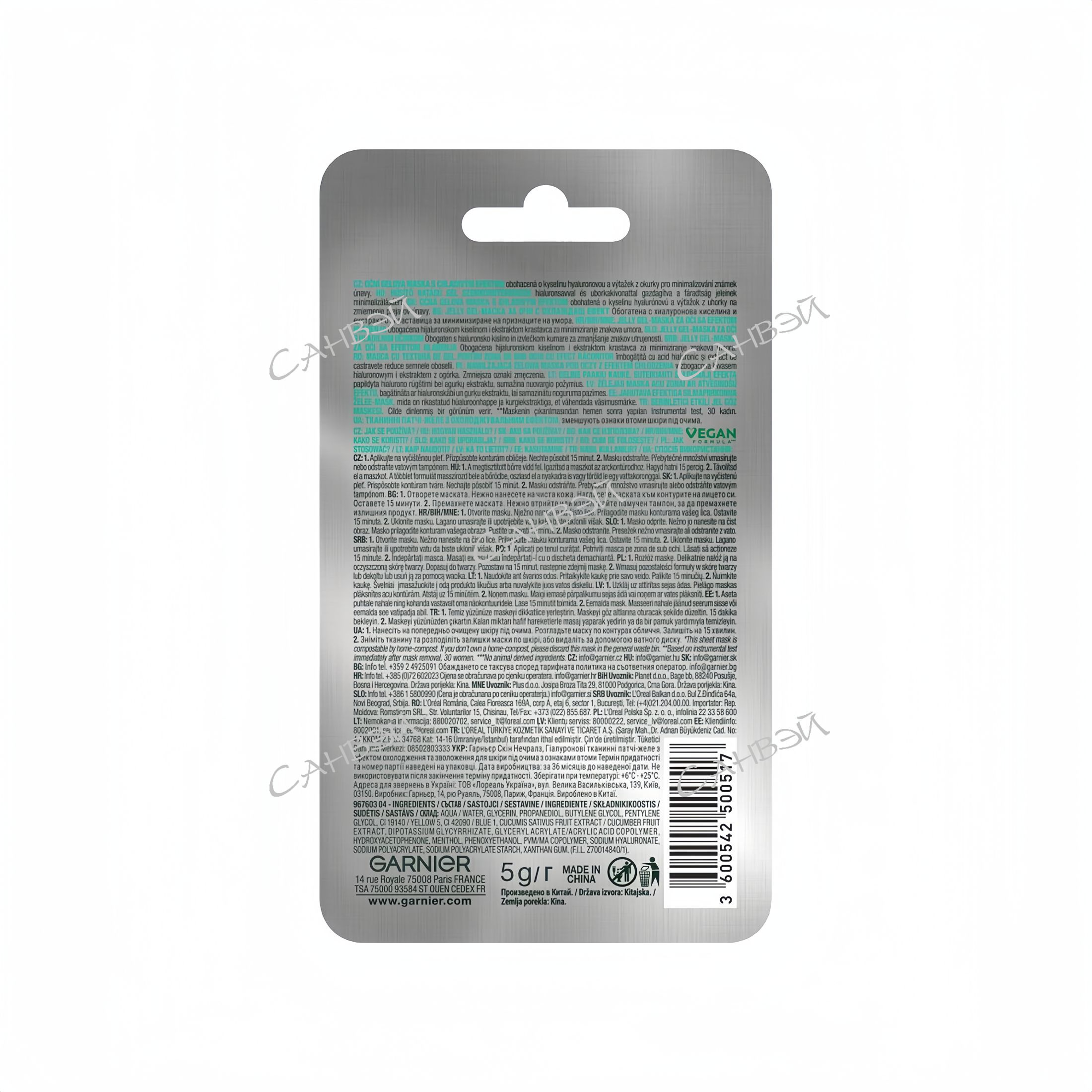 AQUA / WATER, GLYCERIN, PROPANEDIOL, BUTYLENE GLYCOL, PENTYLENE GLYCOL, CI 19140 / YELLOW 5, CI 42090 / BLUE 1, CUCUMIS SATIVUS FRUIT EXTRACT / CUCUMBER FRUIT EXTRACT, DIPOTASSIUM GLYCYRRHIZATE, GLYCERYL ACRYLATE/ACRYLIC ACID COPOLYMER,HYDROXYACETOPHENONE, MENTHOL, PHENOXYETHANOL, PVM/MA COPOLYMER, SODIUM HYALURONATE,SODIUM POLYACRYLATE, SODIUM POLYACRYLATE STARCH, XANTHAN GUM. (F.I.L. Z70014840/1)