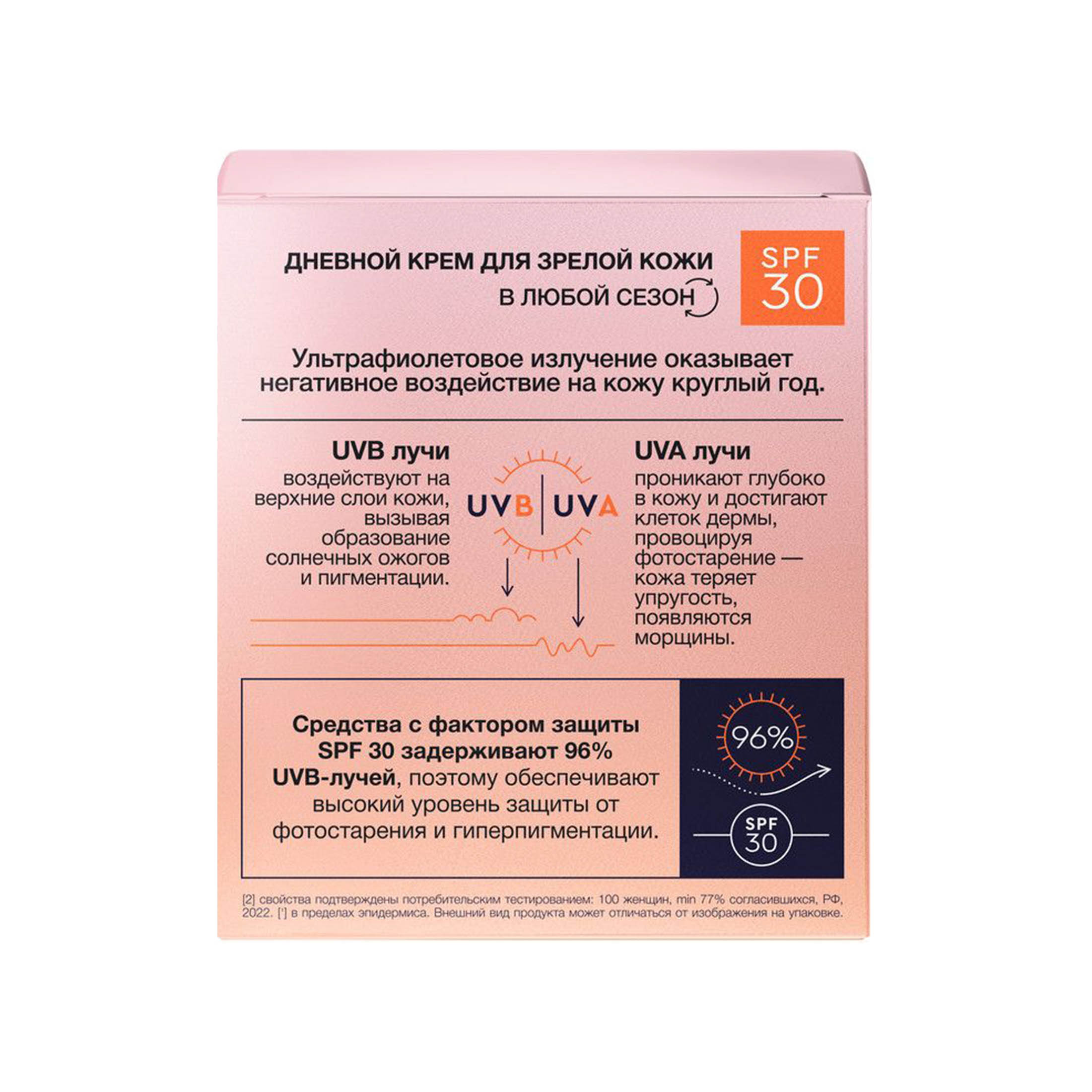 - SPF 30 создает защитный экран от UV-излучения, препятствует преждевременному старению и гиперпигментации. Средства с фактором защиты SPF 30 задерживают 96% UVB-лучей, поэтому обеспечивают высокий уровень защиты от фотостарения и гиперпигментации.