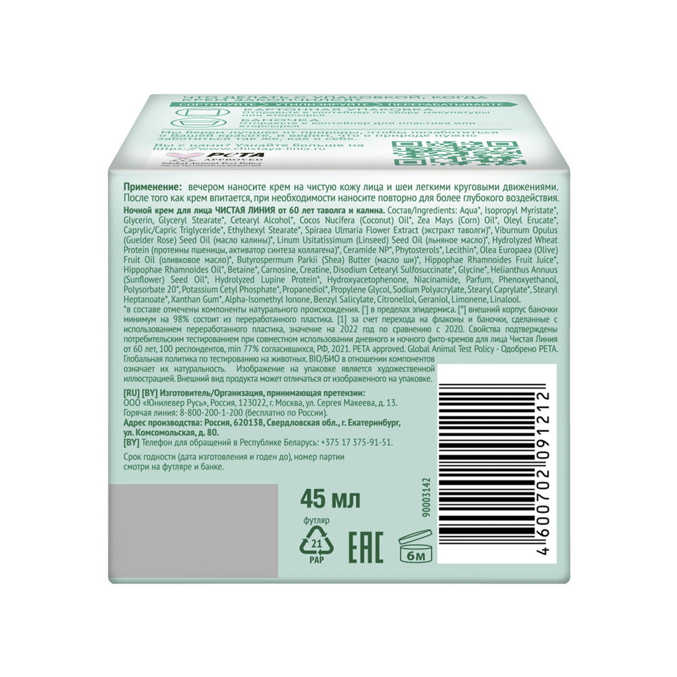 Чистая Линия ночной крем для лица активное омоложение от 60 лет таволга и калина 45 мл в магазине Санвэй. Зрелой коже нужен специальный уход, направленный на сохранение упругости и тонуса кожи. Именно поэтому эксперты лаборатории Чистая линия разработали специальную линейку фито-кремов от 60 лет, которая бережно заботится о зрелой коже, оказывает заметный лифтинг-эффект и освежает кожу.