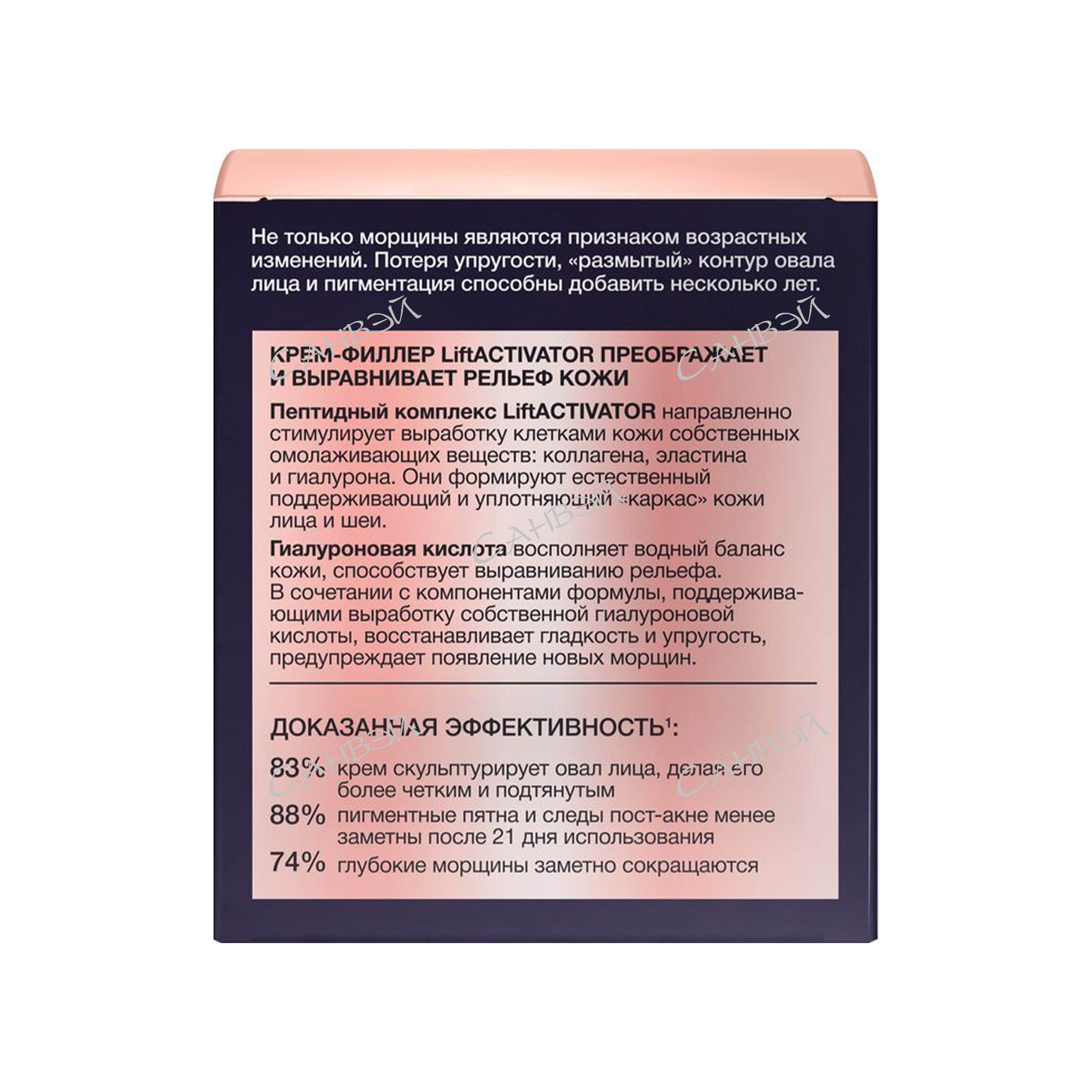 - Пептидный комплекс ЛифтАКТИВАТОР стимулирует выработку в клетках кожи коллагена, эластина и гиалурона. Крем восполняет водный баланс кожи и способствует выравниванию ее рельефа.