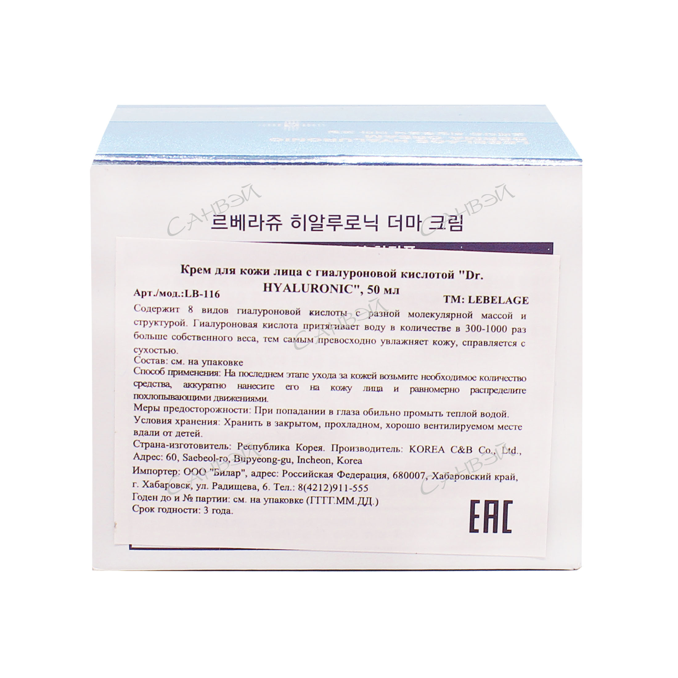 Артикул:LB-116 ТМ:LEBELAGE Содержит 8 видов гиалуроновой кислоты с разной молекулярной массой и структурой. Гиалуроновая кислота притягивает воду в количестве в 300-1000 раз больше собственного веса, тем самым превосходно увлажняет кожу, справляется с сухостью. Меры предосторожности:при попадании в глаза обильно промыть теплой водой. Условия хранения:хранить в закрытом, прохладном, хорошо вентилируемом месте вдали от детей.