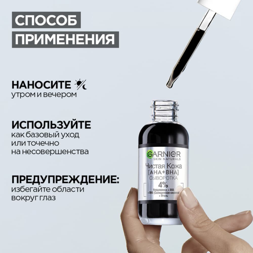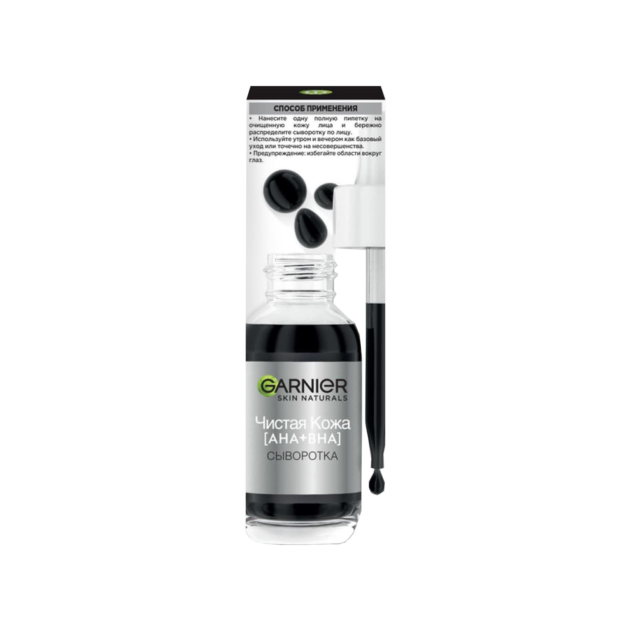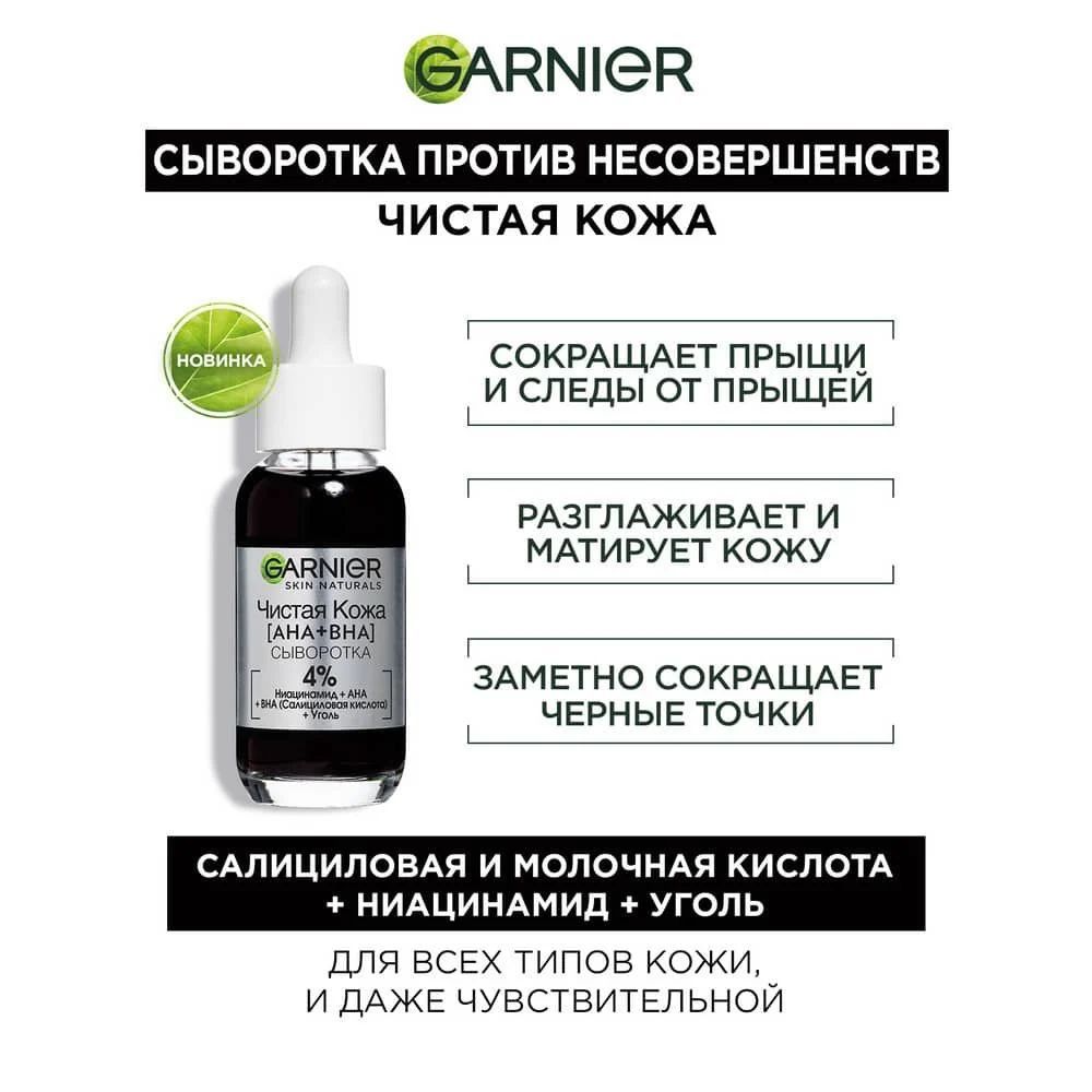 Борьба с расширенными порами, воспалениями и постакне станет еще эффективнее с Сывороткой Garnier [AHA + BHA] Чистая кожа! Формула с древесным углем, разработанная специально для проблемной, склонной к несовершенствам кожи, одновременно отшелушивает ороговевшие клетки и увлажняет эпидермис, помогая раскрыть природную мягкость и сияние лица.