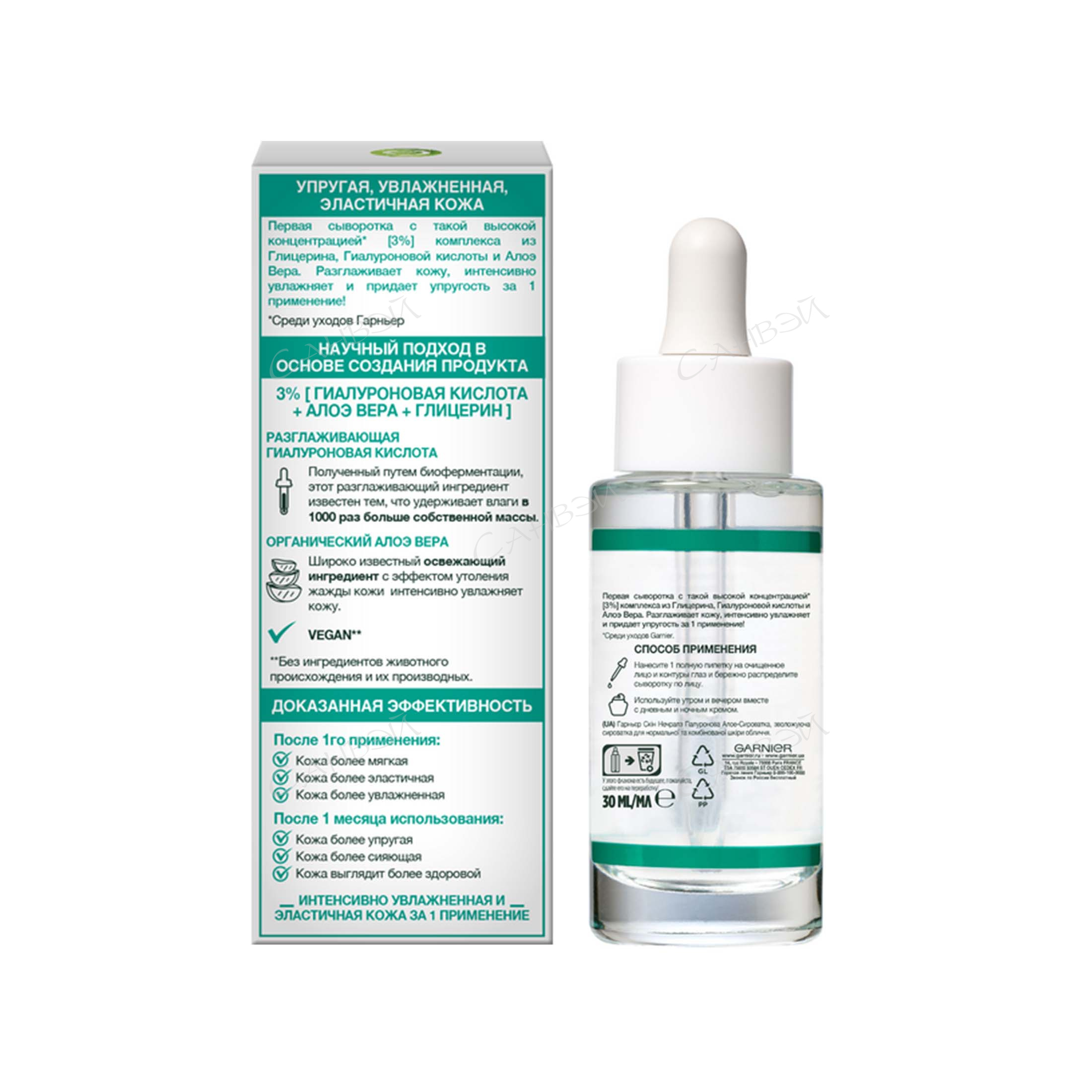 Алоэ вера восполняет дефицит влаги в коже и освежает цвет лица. Гиалуроновая кислота удерживает влагу и препятствует ее испарению, тем самым восстанавливает объем кожи, повышает ее упругость, усиливает барьерные свойства.