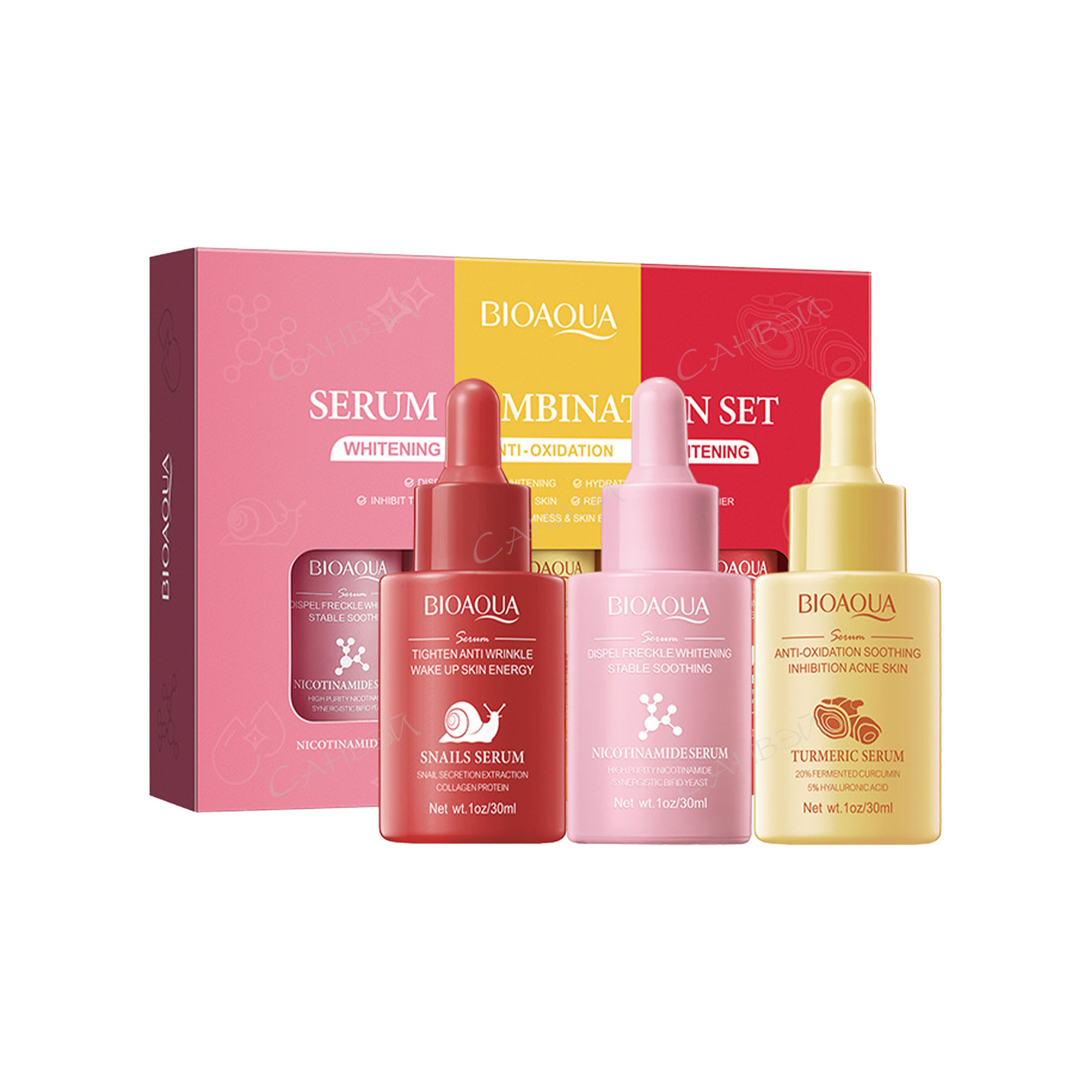 1. сыворотка с муцином улитки: Water,Glycerin, Propylene Glycol,Glycerol Polyether-26,Phenoxyethanol, Methyl Hydroxybenzene,Carbomer, Triethanolamine,Hydroxyethyl Cellulose, Peg-40 Hydrogenated Castor Oil, Octyl Hydroxamic Acid, Disodium Edta,Essence,Sodium Hyaluronate,Glycerol Octanoate,Snail Secretion Filtrate, Collagen 2.сыворотка с экстрактом длинной куркумы: Water, Glycerin, Propylene Glycol,Bis(hydroxymethyl) lmidazolidinyl Urea,Sclerotium Rolfssii Glue, Methyl Paraben,Carbomer, Triethanolamine,Ci 19140, Peg-40Hydrogenated Castor Oil, Sodium Polyacrylate,Ci 16255,Essence, lodopropylButyl Carbamate,Curcuma Longa Root Extract,Hyaluronic Acid 3.сыворотка с никотинамидом: Water, Propylene Glycol, Betaine,Glycerol Polyether-26, Niacinamide,Allantoin,Methyl Paraben,Hydroxyethyl Cellulose, Bis(hydroxymethyl)lmidazolidinyl Urea, 3-0-ethyl AscorbicAcid,Peg-40Hydrogenated Castor Oil,Essence,Dichotomous Yeast