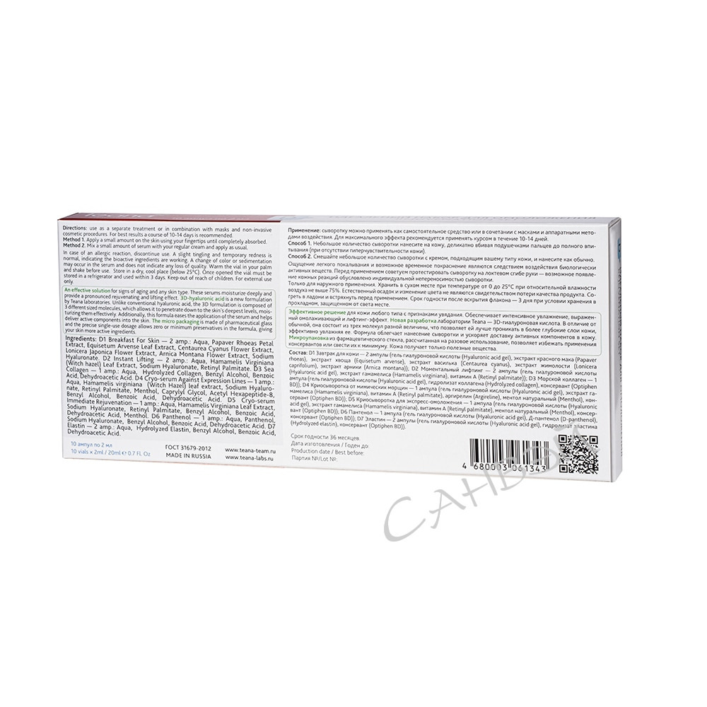 - D1 Завтрак для кожи — 2 ампулы (Гель гиалуроновой кислоты (Hyaluronic Acid gel), экстракт красного мака (Papaver rhoeas), экстракт хвоща (Equisetum arvense), экстракт василька (Centaurea cyanus), экстракт жимолости (Lonicera caprifolium), экстракт арники (Arnica montana);