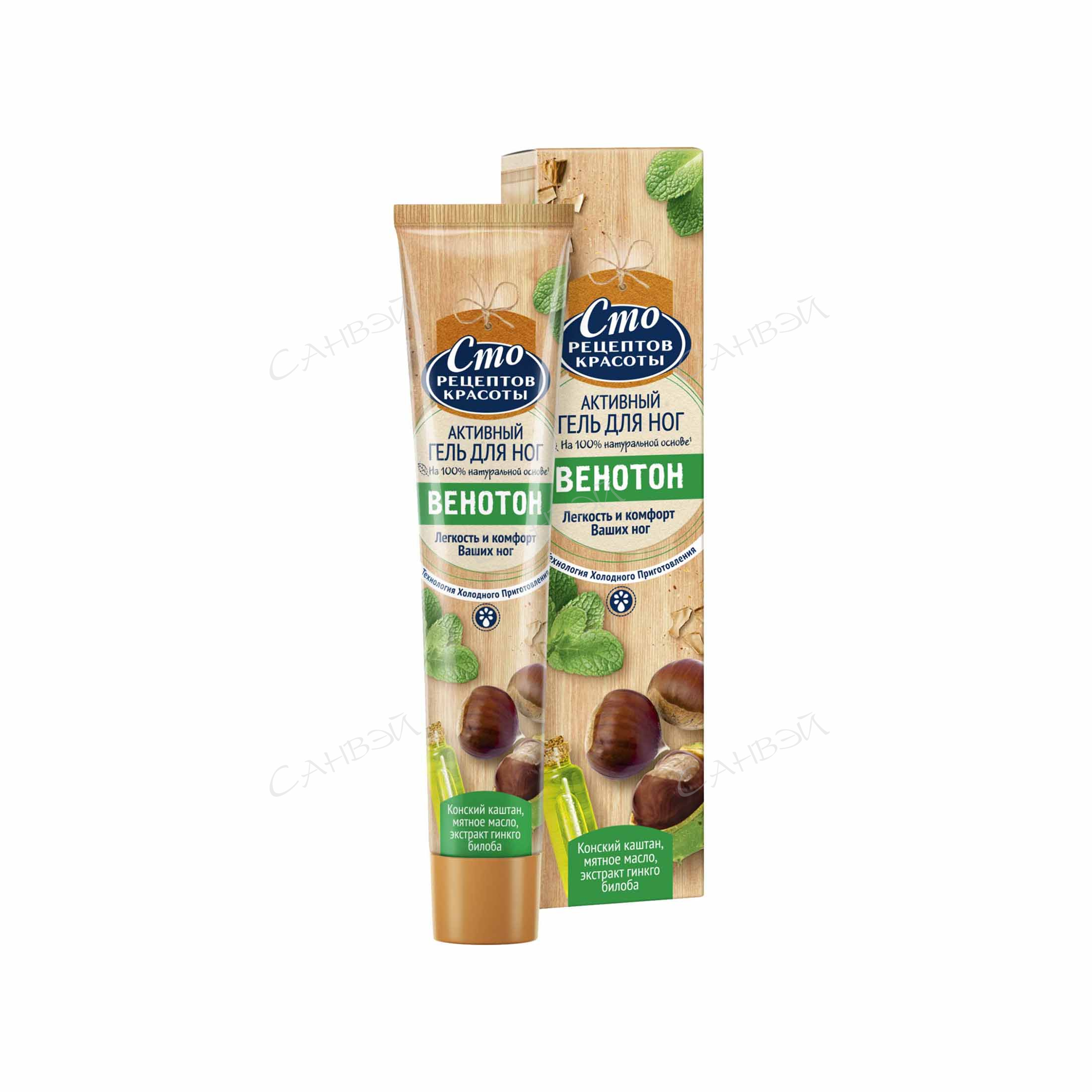 Гель для ног Венотон от бренда Сто Рецептов Красоты активного действия на основе конских каштанов, чаги и мятного масла из Санвэй уменьшает тяжесть и напряжение в ногах, тонизирует, создает эффект отдохнувших ног. Способствует повышению тонуса сосудов и вен, устраняет симптомы проблем с ногами - чувства усталости, тяжести, напряжения и отечности. Теперь тебе не страшны каблуки и долгие продукты! Сделай гель для ног Венотон от бренда Сто Рецептов Красоты своим верным спутником в долгих прогулках!