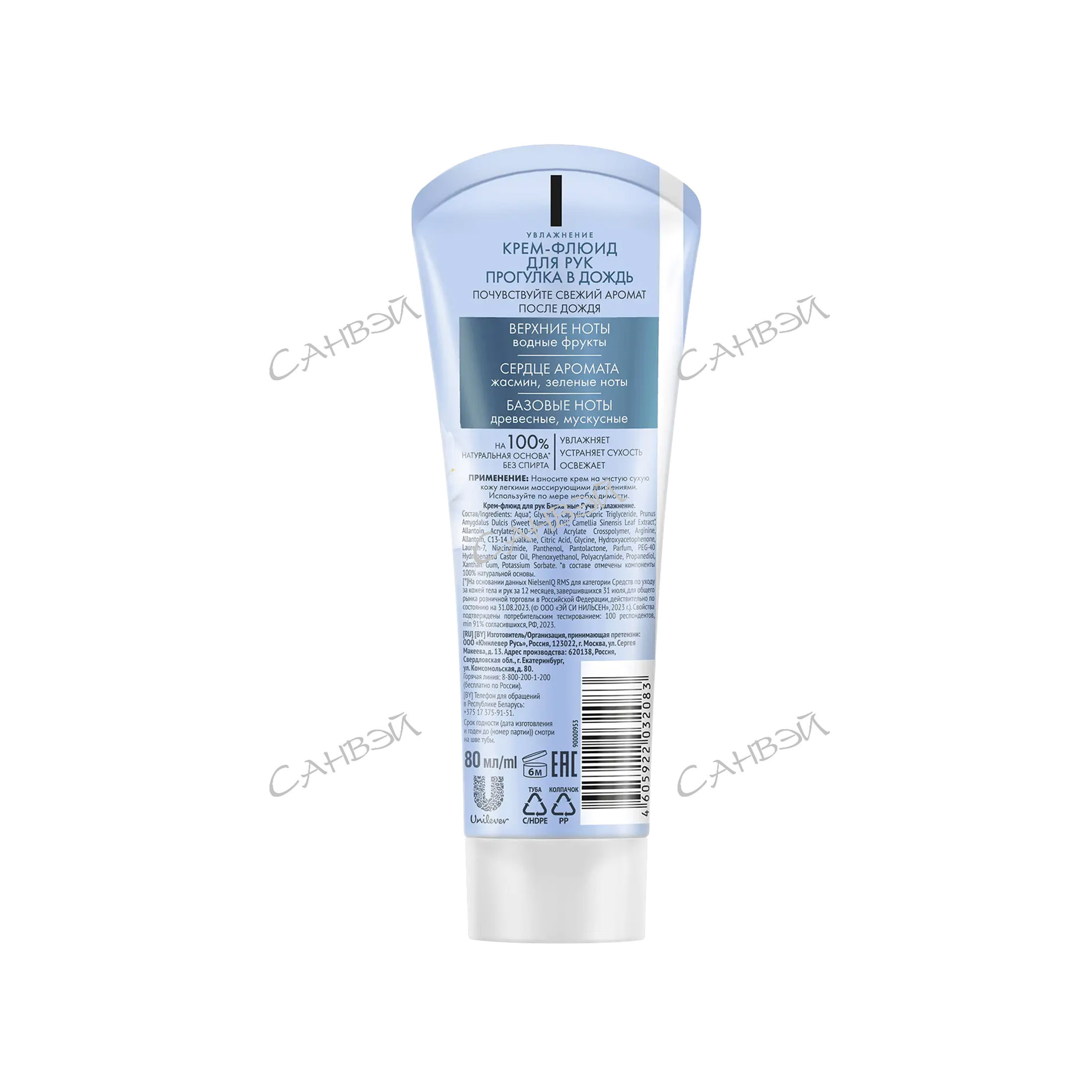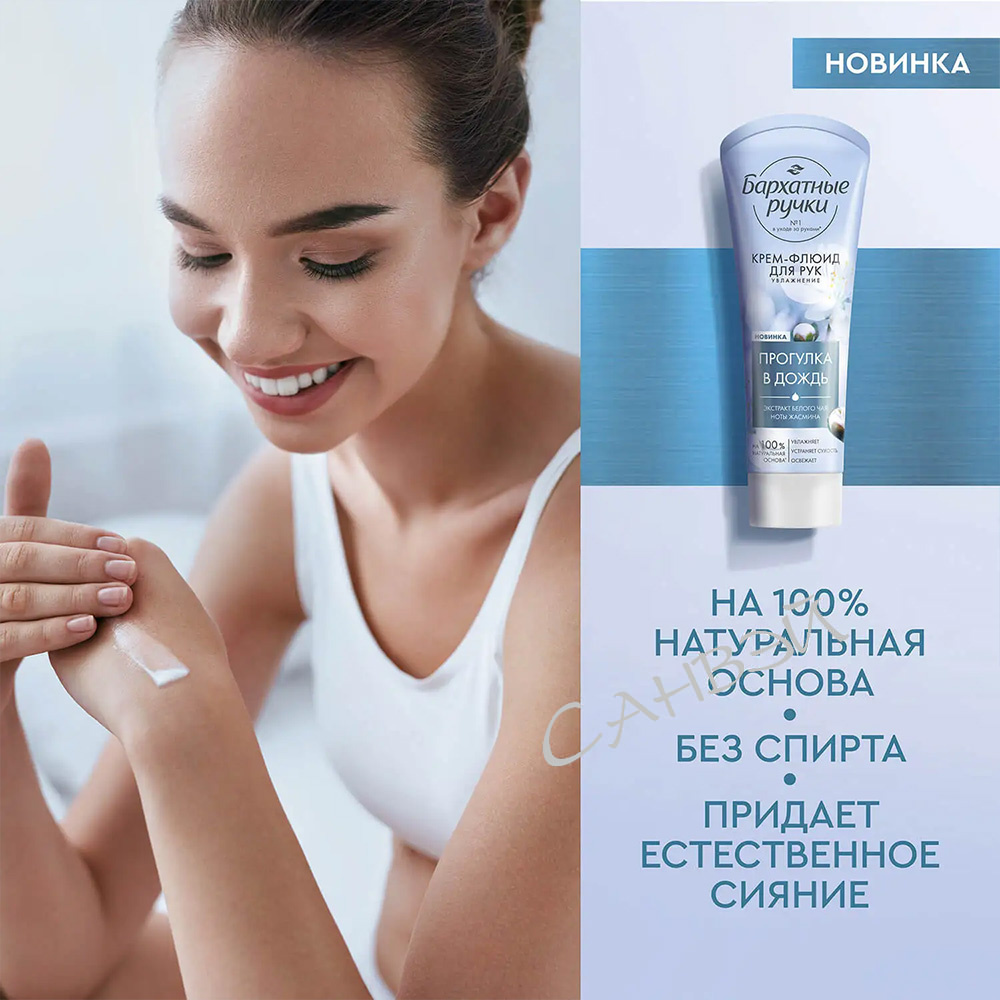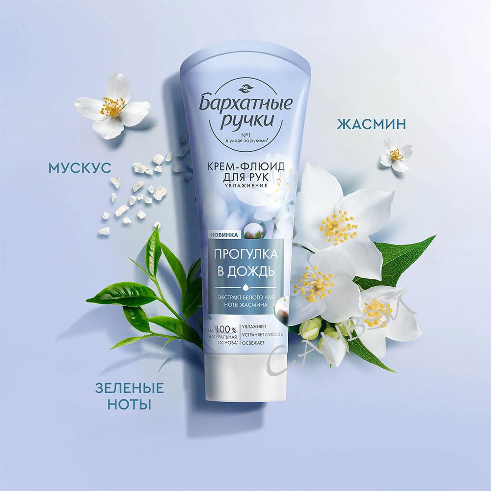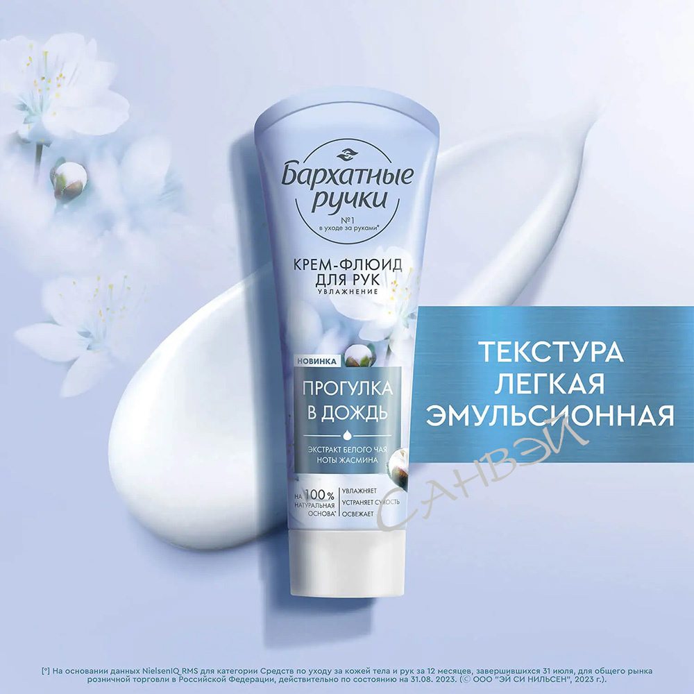 Бархатные ручки Парфюмированный крем-флюид Увлажнение Прогулка в дождь 80 мл из интернет-магазина Санвэй имеет 100% натуральную основу, обогащенную экстрактом белого чая и маслом миндаля.