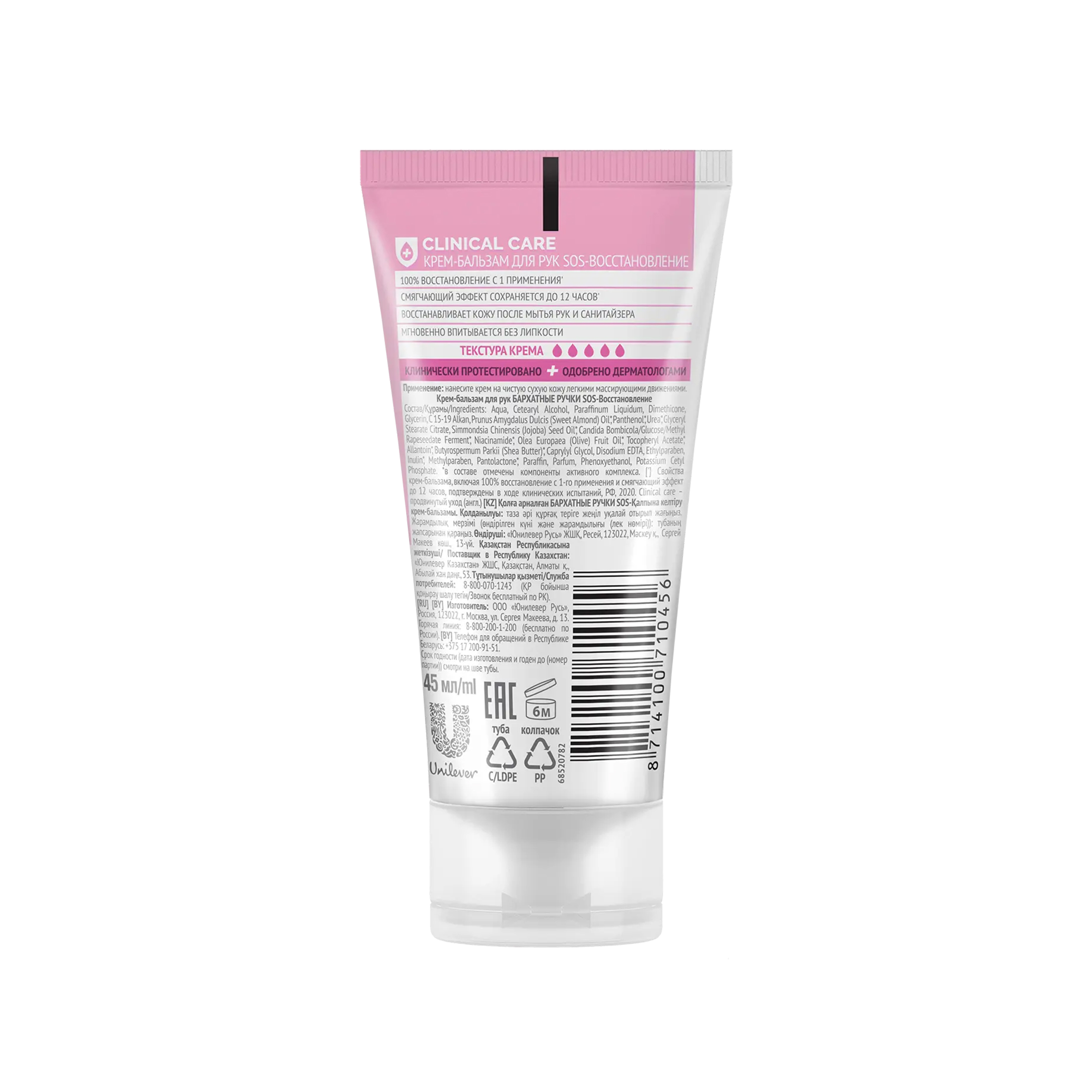 Aqua, Glycerin, Cetearyl Alcohol, Paraffinum Liquidum, Cyclopentasiloxane, Urea, Dimethicone, Panthenol, Glyceryl Stearate Citrate, Triisostearin, Potassium Cetyl Phosphate, Prunus Amygdalus Dulcis (Sweet Almond) Oil'", Simmondsia Chinensis (Jojoba) Seed Oil', Squalane, Aloe Barbadensis Leaf Juice, Tocopheryl Acetate, Allantoin, Dimethyl Sulfone, Biosaccharide Gum-1, Hydrolyzed Silk, Artemia Extract, Caprylyl Glycol, Disodium EDTA, Ethylparaben, Methylparaben, Pantolactone, Paraffin, Parfum, Phenoxyethanol, Potassium Sorbate, Sodium Benzoate, Sodium Sulfite, Alpha-lsomethyl Ionone, Butylphenyl Methylpropional, Citronellol, Hexyl Cinnamal, Hydroxycitronellal, Limonene, Linalool ' Крем-бальзам содержит богатые витаминами натуральные масла, отмеченные в составе.