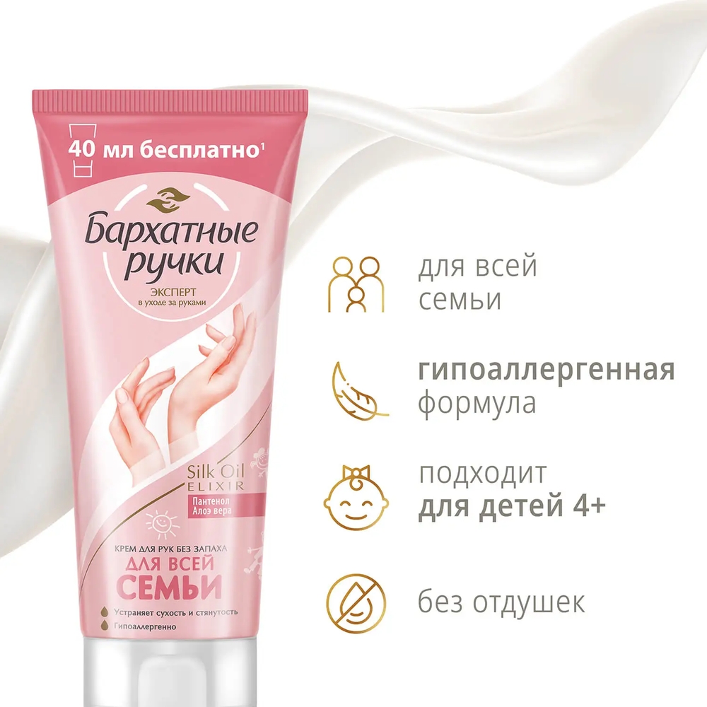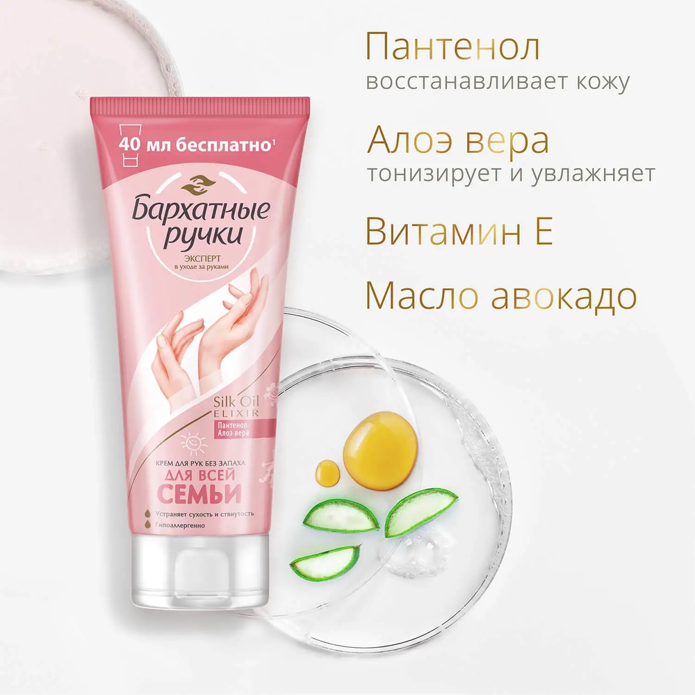 Бренд Бархатные Ручки представляет крем для рук Для меня и моей семьи. Гипоаллергенная формула без запаха разработана специально для бережного ухода за чувствительной кожей рук и ежедневного ухода. Крем увлажняет, питает и смягчает кожу, уменьшая шелушение и признаки раздражения. Благодаря легкой текстуре, крем быстро впитывается, а отсутствие выраженного запаха и красителей обеспечивает комфортное использование для каждого члена семьи.
