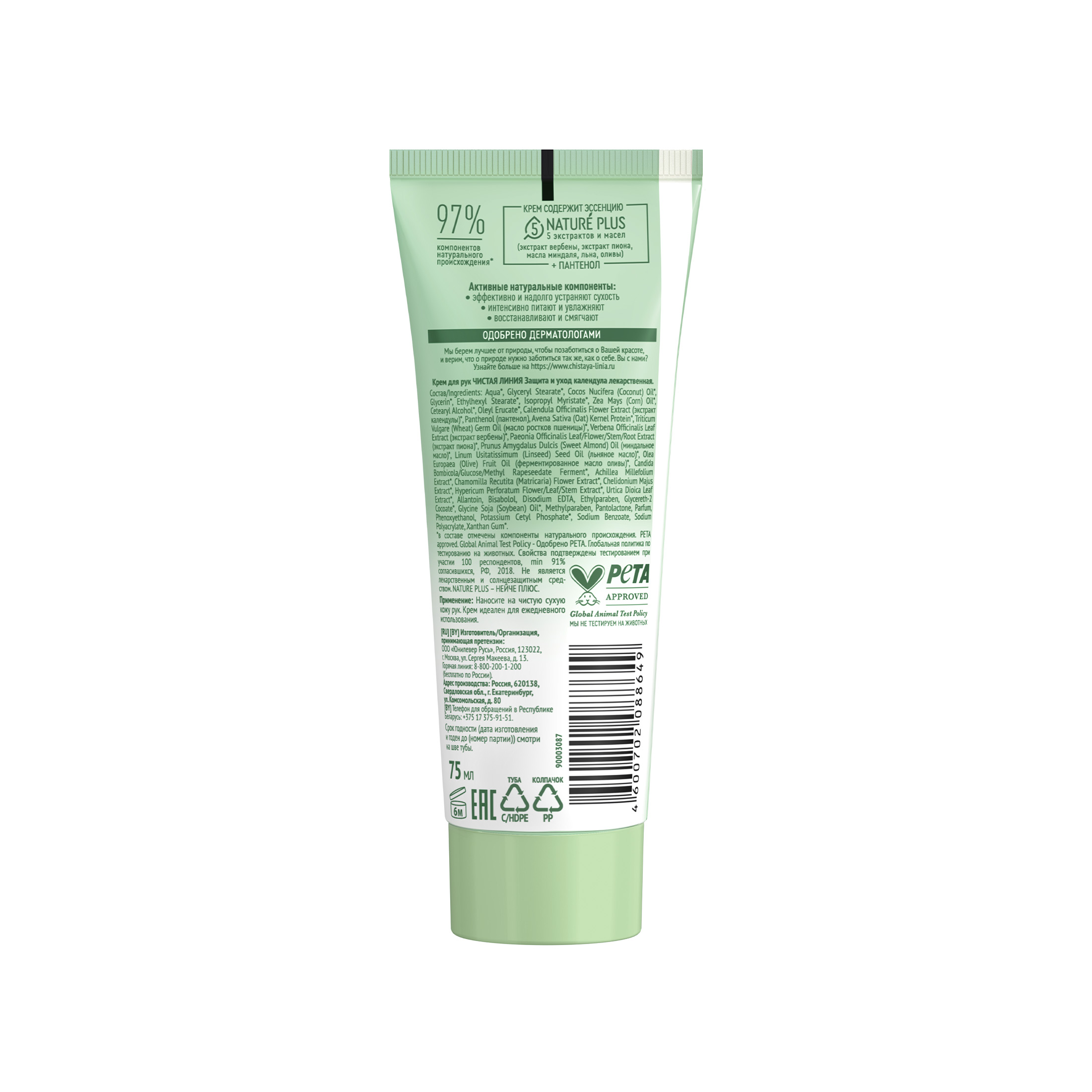 Aqua, Glyceryl Stearate, Cocos Nucifera (Coconut) Oil, Glycerin, Ethylhexyl Stearate, Isopropyl Myristate, Zea Mays (Corn) Oil, Cetearyl Alcohol, Oleyl Erucate, Calendula Officinalis Flower Extract (экстракт календулы), Panthenol (пантенол), Avena Sativa (Oat) Kernel Protein, Triticum Vulgare (Wheat) Germ Oil (масло ростков пшеницы), Verbena Officinalis Leaf Extract (экстракт вербены), Paeonia Officinalis Leaf/Flower/Stem/Root Extract (экстракт пиона), Prunus Amygdalus Dulcis (Sweet Almond) Oil (миндальное масло), Linum Usitatissimum (Linseed) Seed Oil (льняное масло), Olea Europaea (Olive) Fruit Oil (ферментированное масло оливы), Candida Bombicola/Glucose/Methyl Rapeseedate Ferment, Achillea Millefolium Extract, Chamomilla Recutita (Matricaria) Flower Extract, Chelidonium Majus Extract, Hypericum Perforatum Flower/Leaf/Stem Extract, Urtica Dioica Leaf Extract, Allantoin, Bisabolol, Disodium EDTA, Ethylparaben, Glycereth-2 Cocoate, Glycine Soja (Soybean) Oil, Methylparaben, Pantolactone, Parfum, Phenoxyethanol, Potassium Cetyl Phosphate, Sodium Benzoate, Sodium Polyacrylate, Xanthan Gum.