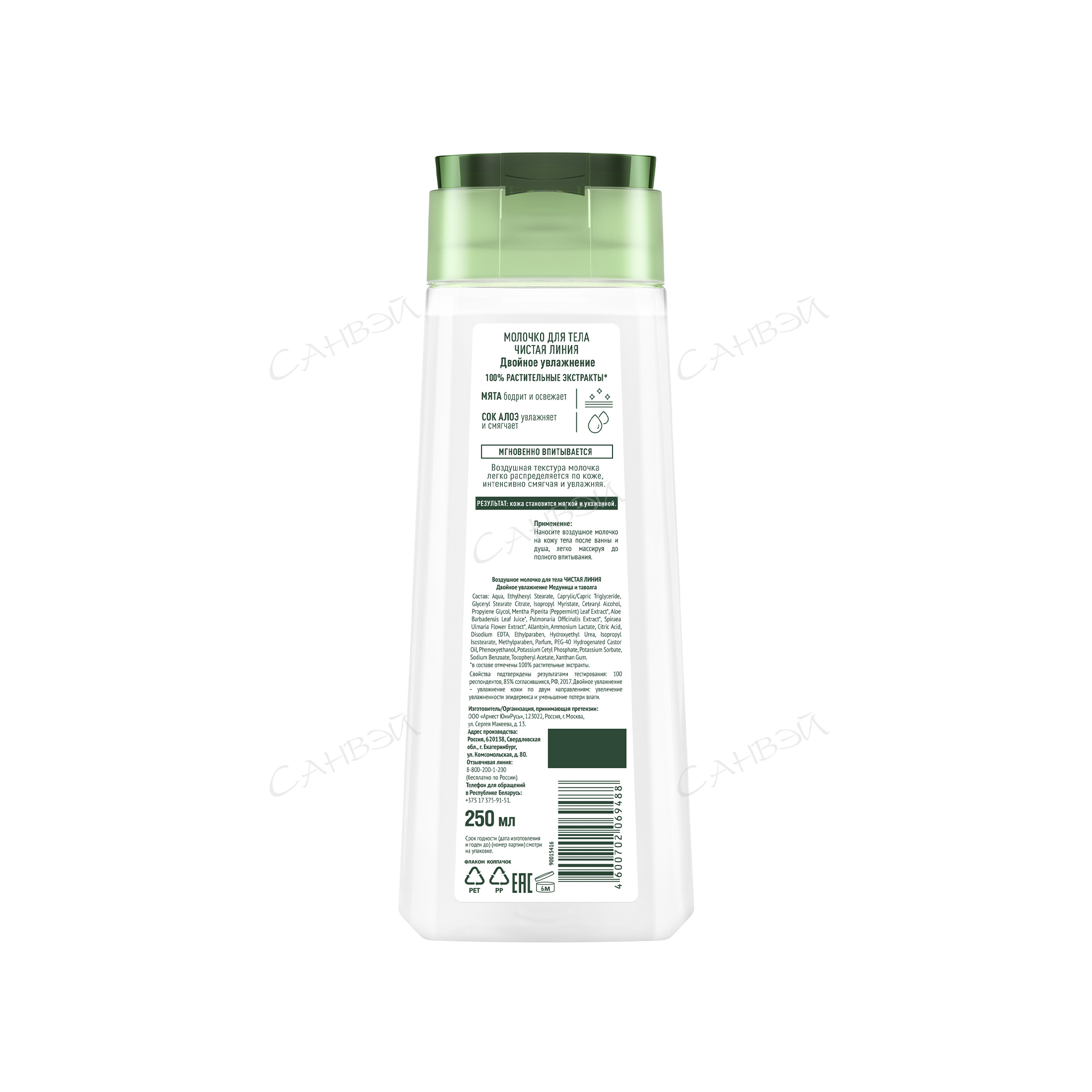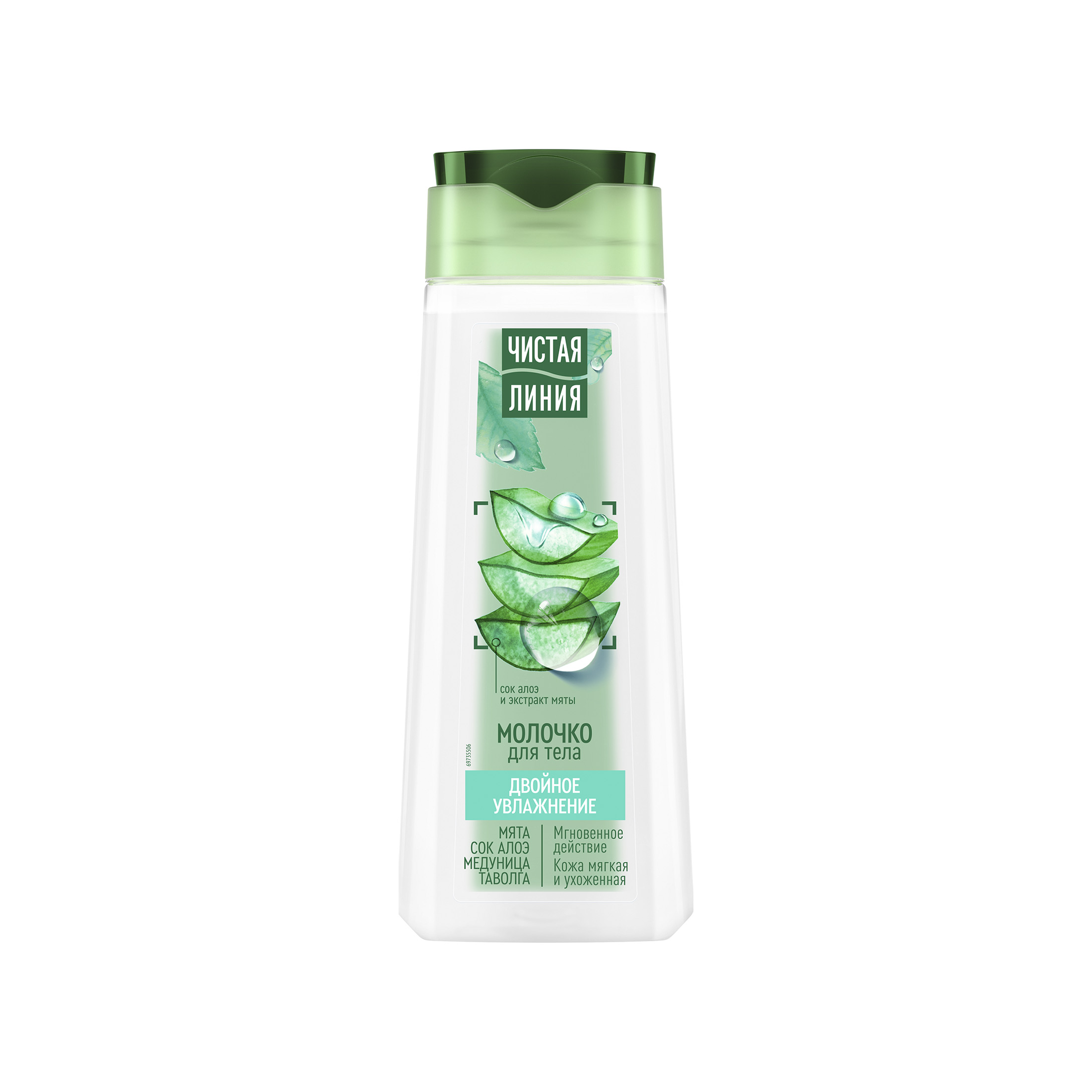 Воздушное молочко для тела Чистая линия Фитотерапия Двойное увлажнение с медуницей и таволгой обеспечивает бережный уход за кожей, дарит ей увлажнение и мягкость. Входящая в состав средства мята бодрит и дарит ощущение свежести, а сок алоэ устраняет ощущение сухости и смягчает кожу. 100% растительные экстракты.