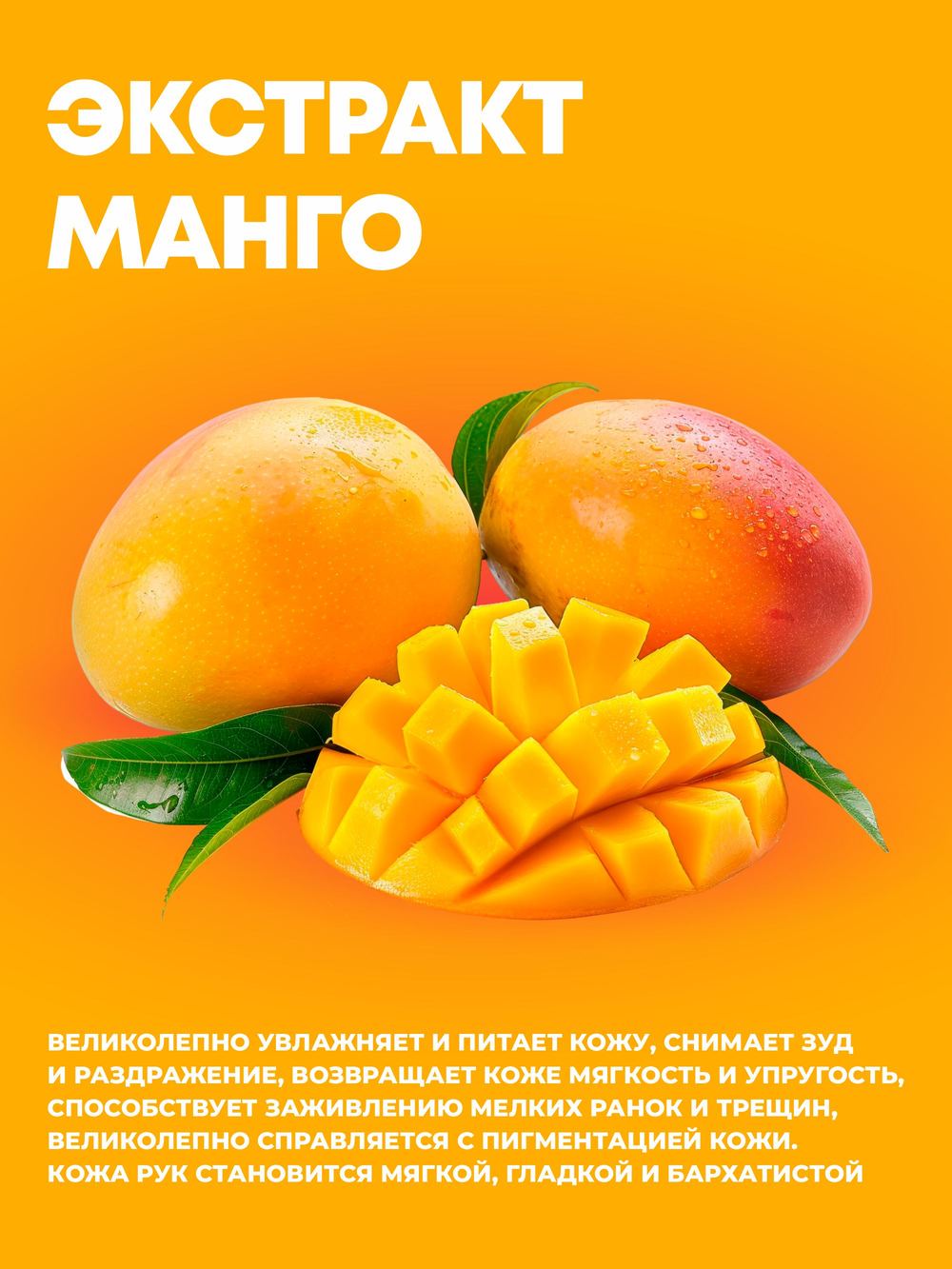 Увлажняющий крем с маслом манго эффективно смягчает, успокаивает и осветляет кожу рук. Экстракт манго в составе крема оказывает противовоспалительное, регенерирующее, увлажняющее, фотозащитное действие, смягчает огрубевшую кожу, разглаживает ее и осветляет пигментацию, заметно освежает и омолаживает, устраняет сухость и шелушение, ускоряет процесс заживления повреждений. Масло манго поддерживает необходимый уровень увлажненности кожи при агрессивном воздействии солнца, ветра и мороза.