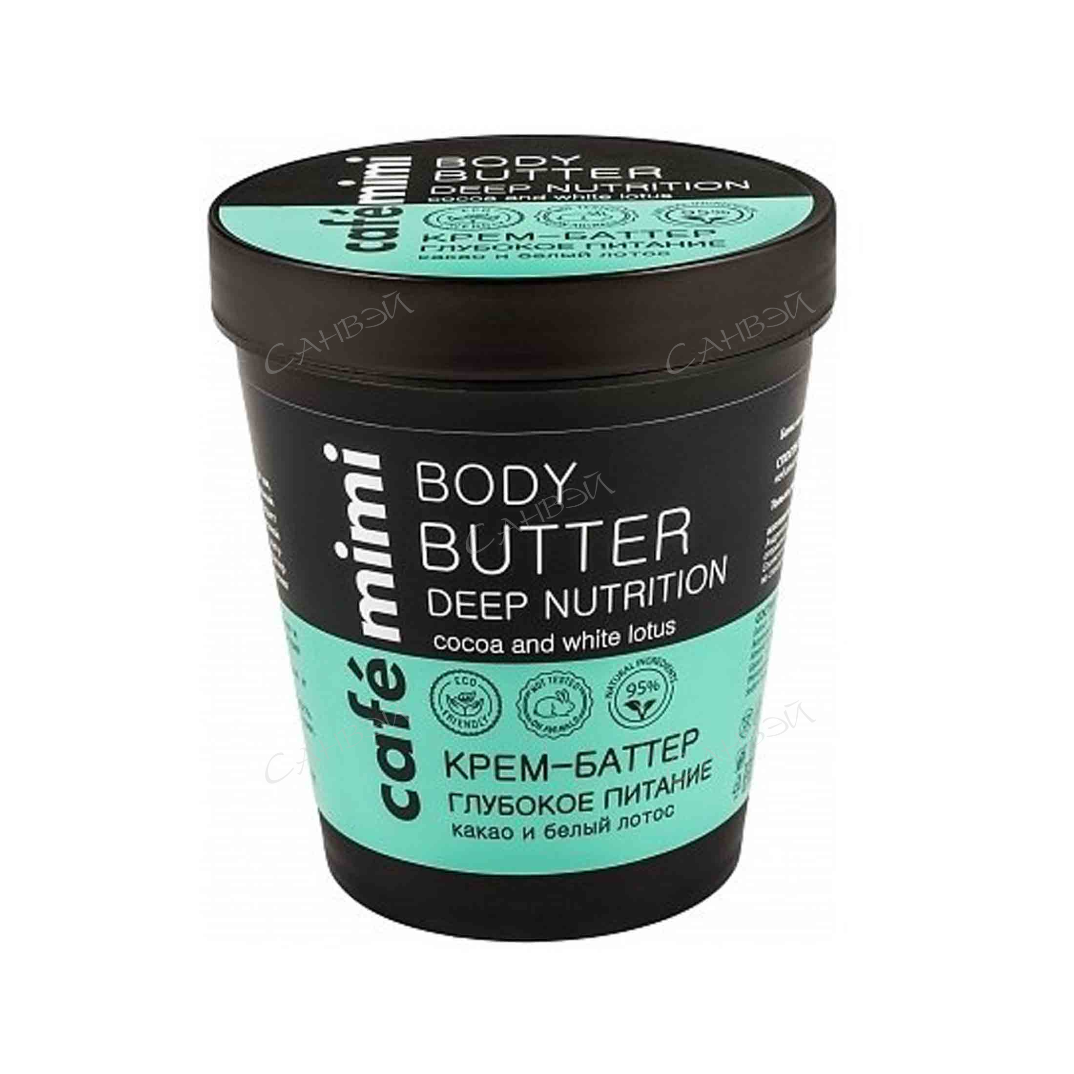 Крем-баттер Cafe Mimi Глубокое питание на основе масел какао и ши, экстракта белого лотоса - это ультрапитательный уход для всех типов кожи. Крем-баттер обладает приятным ароматом и невероятно нежной текстурой. Благодаря особой формуле и натуральным активным ингредиентам крем-баттер является эффективным средством для решения множества задач: Масло какао – для глубокого питания и защиты кожи от неблагоприятного воздействия окружающей среды; Масло ши – для смягчения, увлажнения и интенсивного восстановления кожи; Экстракт белого лотоса - придает коже упругость, стимулирует процессы регенерации клеток кожи, способствует повышению эластичности.
