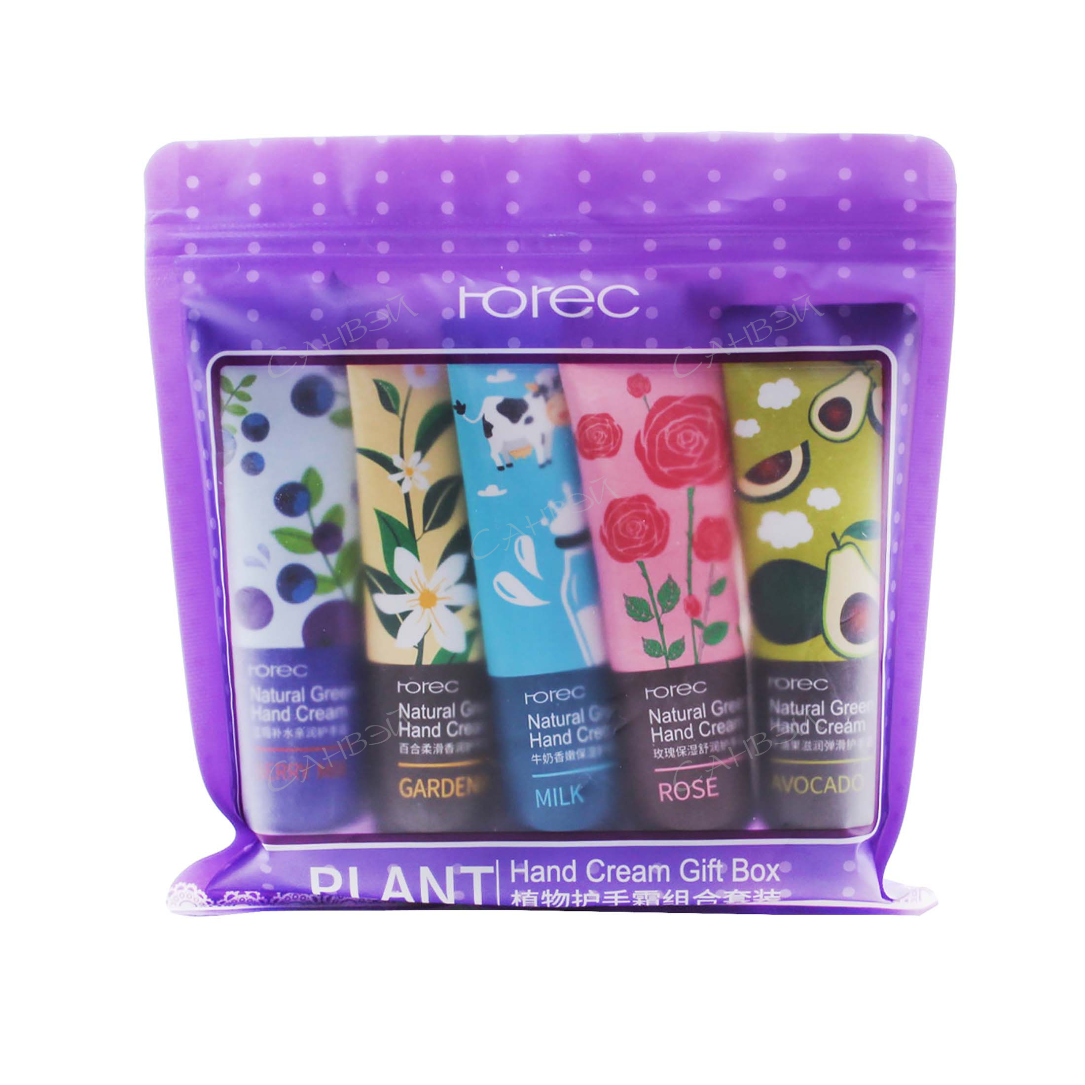 Состав набора: Увлажняющий крем для рук Авокадо; Тонизирующий крем для рук Роза; Смягчающий крем для рук Белая лилия; Защитный крем для рук Молочный; Витаминизирующий крем для рук Ягодный микс.