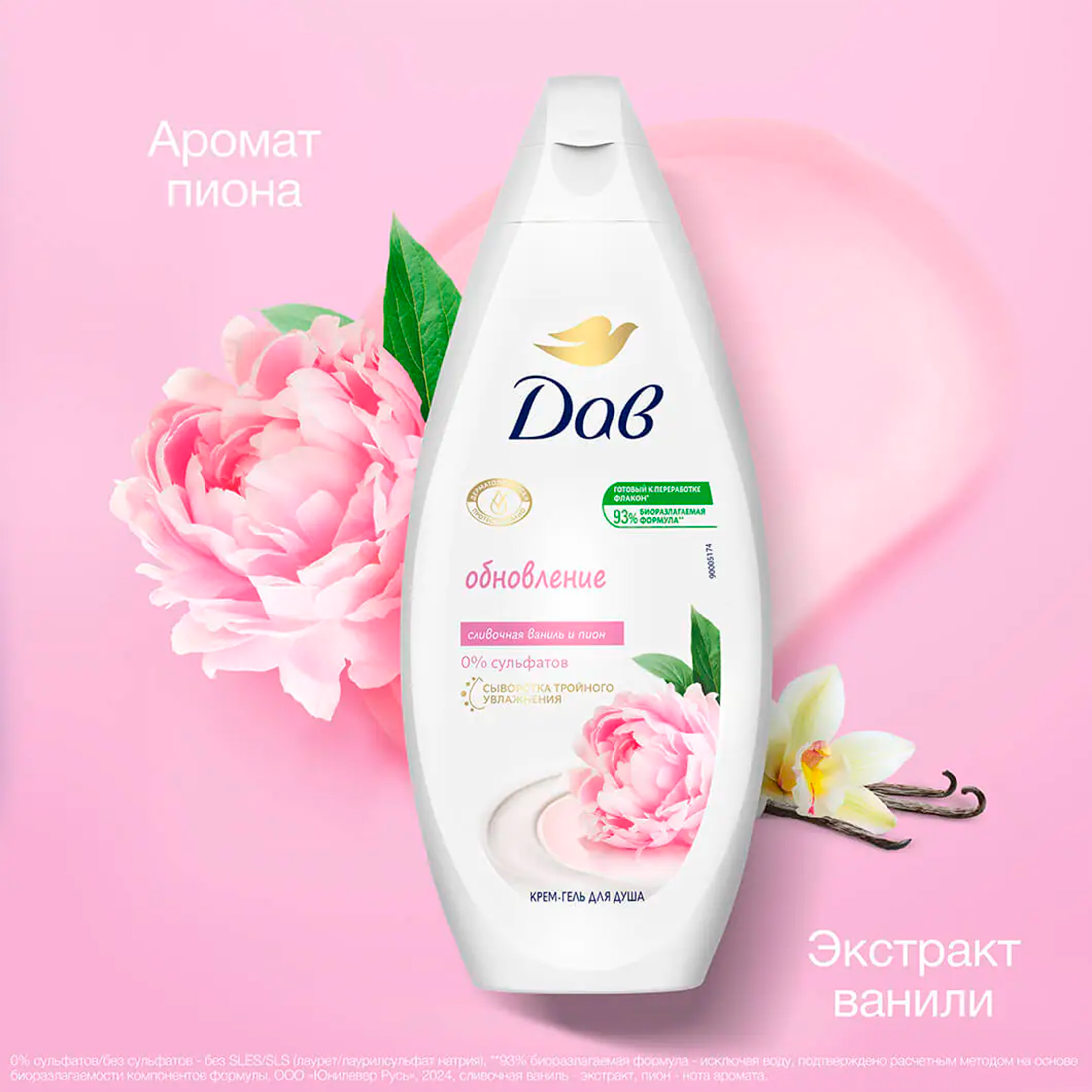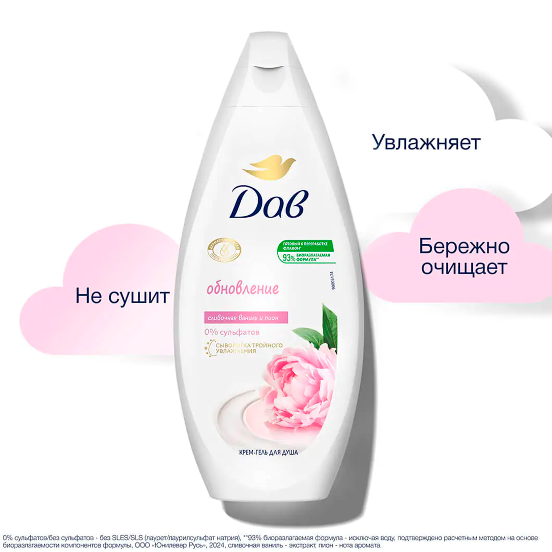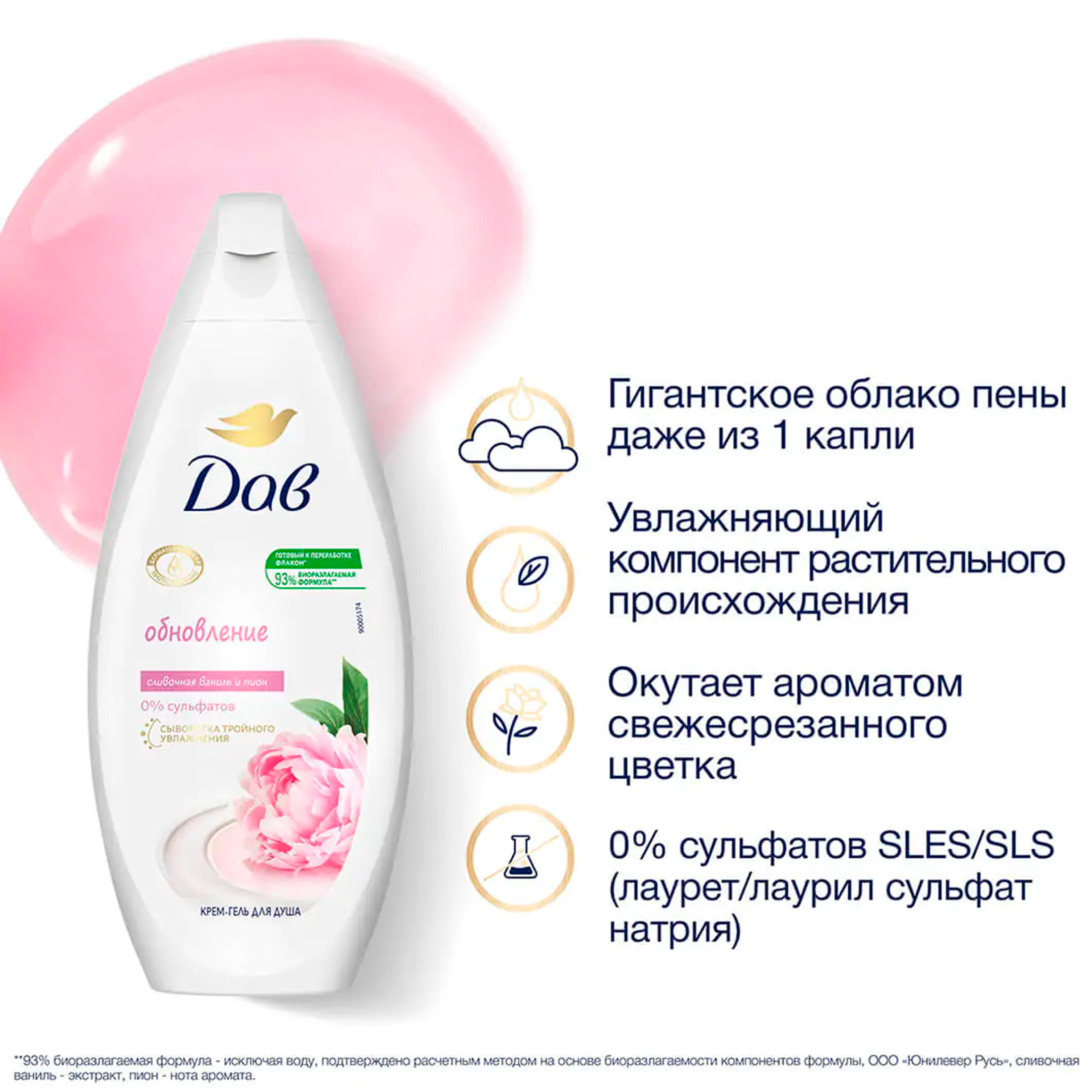 Крем-гель для душа Дав обладает густой пеной и сладким ароматом цветов пиона, который подарит Вам истинное наслаждение. Мягкие очищающие компоненты помогают коже поддерживать естественный водный баланс, а технология NutriumMoisture™ восполняет уровень питательных веществ, необходимых коже, благодаря чему она становится нежной и гладкой сразу после душа.