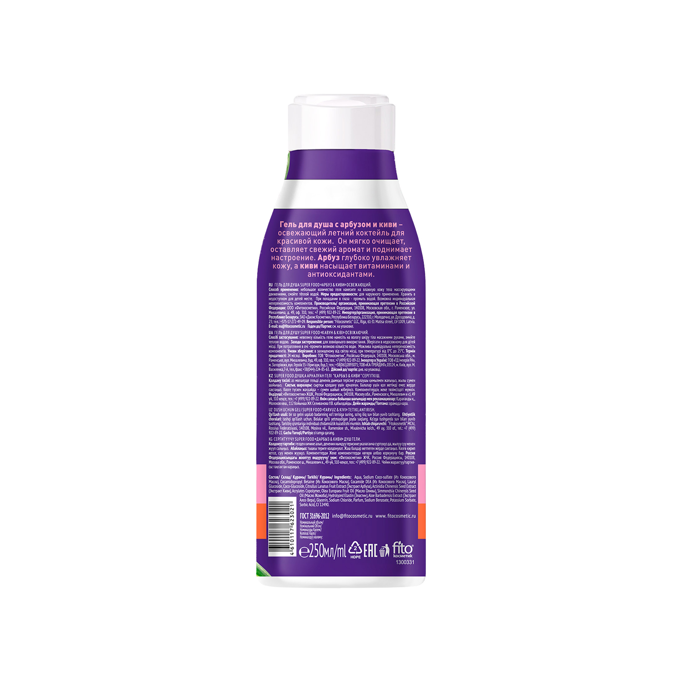 Fito Гель для душа Super food Арбуз и киви Освежающий 250 мл освежающий летний коктейль для красивой кожи. Он мягко очищает, оставляет свежий аромат и поднимает настроение. Арбуз глубоко увлажняет кожу, а киви насыщает витаминами и антиоксидантами.