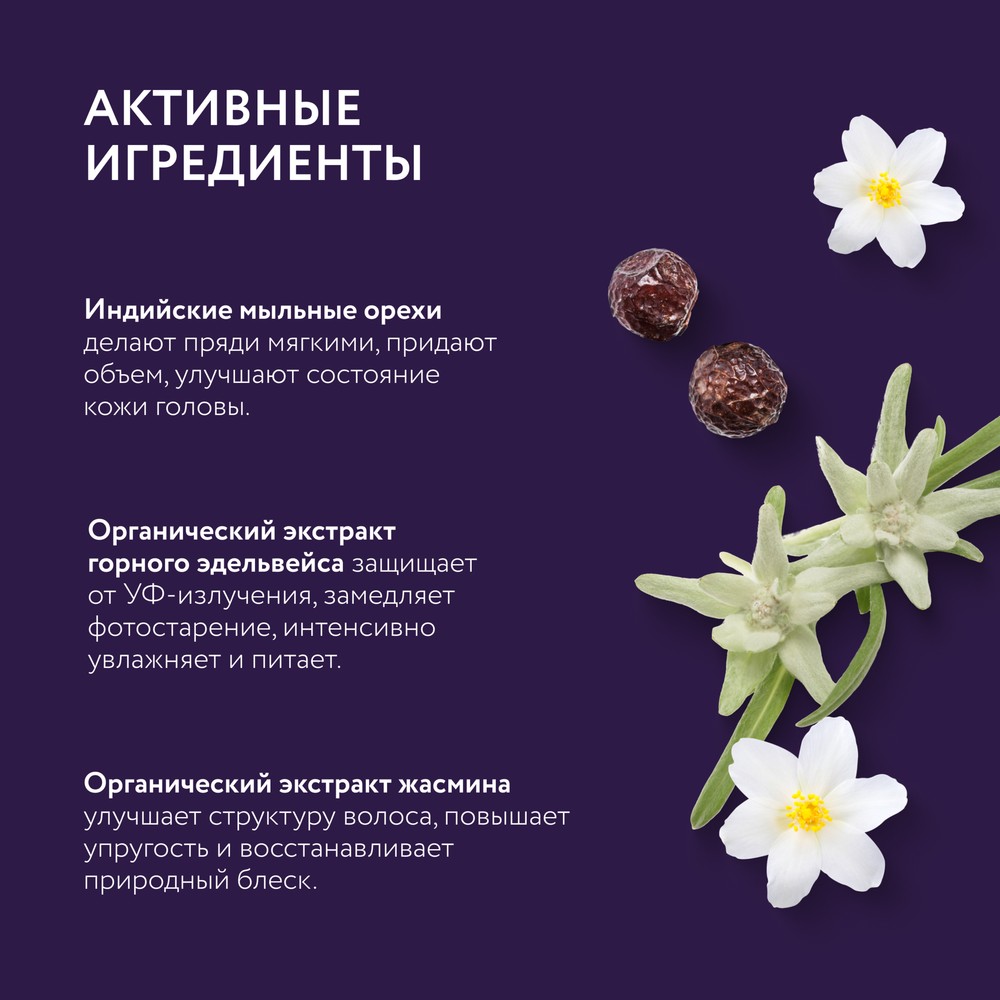 Aqua with infusions of Organic Leontopodium Alpinum Flower/Leaf Extract (органический экстракт горного эдельвейса), Organic Jasminum Officinale Flower Extract (органический экстракт жасмина); Sodium Coco-Sulfate, Cocamidopropyl Betaine, Lauryl Glucoside, Sodium Chloride, Rosa Chinensis Flower Oil (эфирное масло индийской розы), Benzyl Alcohol, Sodium Benzoate, Potassium Sorbate, Citric Acid, Parfum, Benzyl Salicylate,CI 28440, CI 14720.