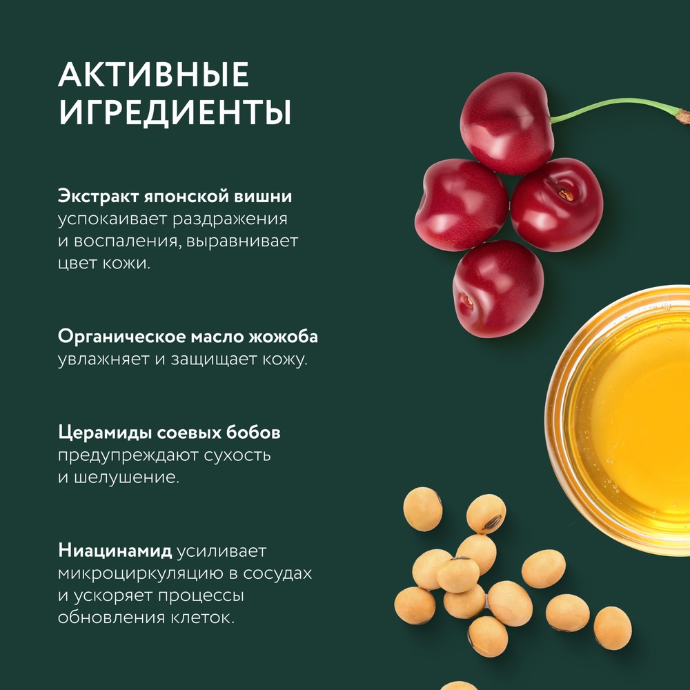 - Экстракт японской вишни успокаивает раздражения и воспаления, выравнивает тон кожи.