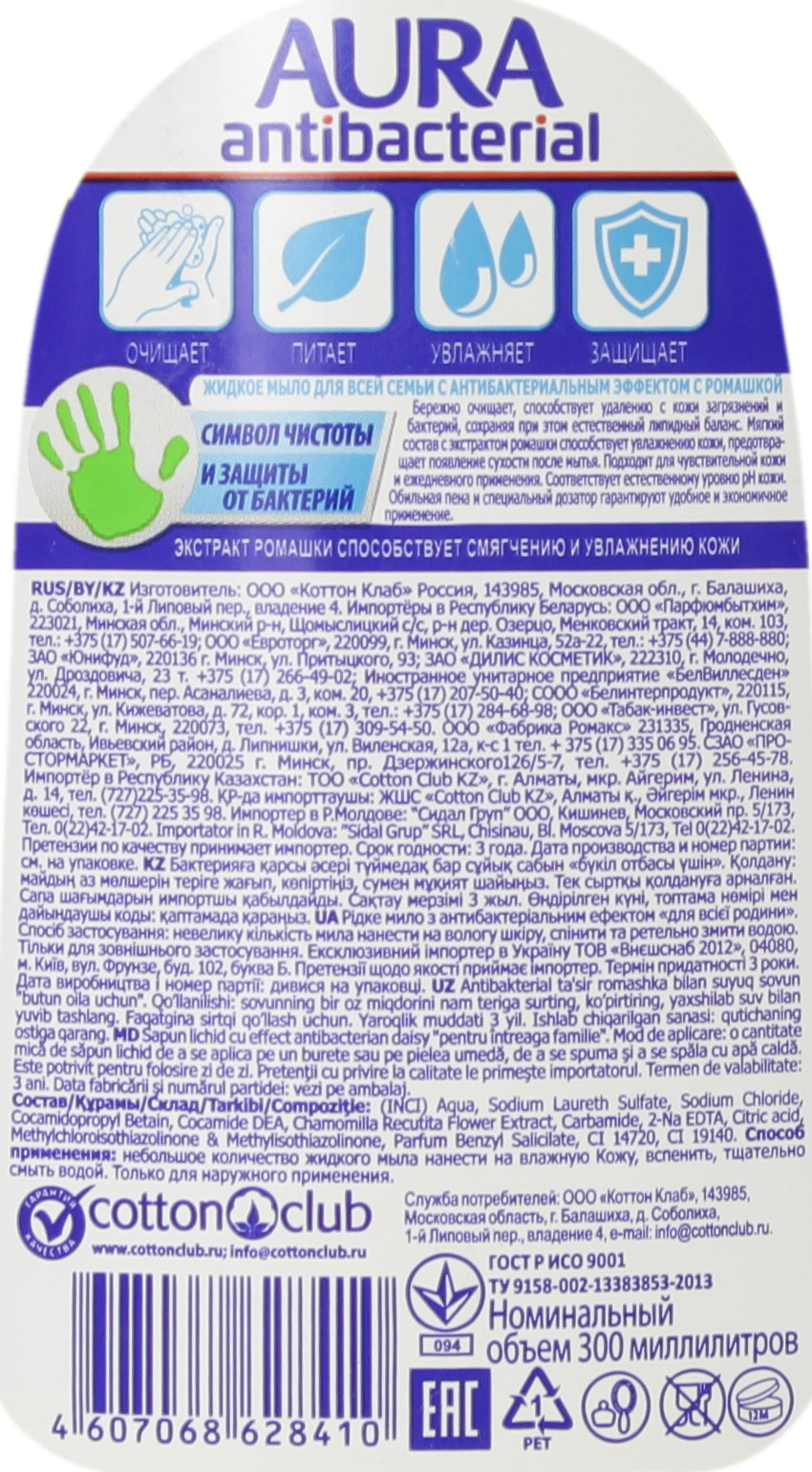 Aura мыло жидкое 300мл антибакт.,увлажн. д/в тип.кожи ромашка дозатор 1шт / 12шт / 10499 / 628410