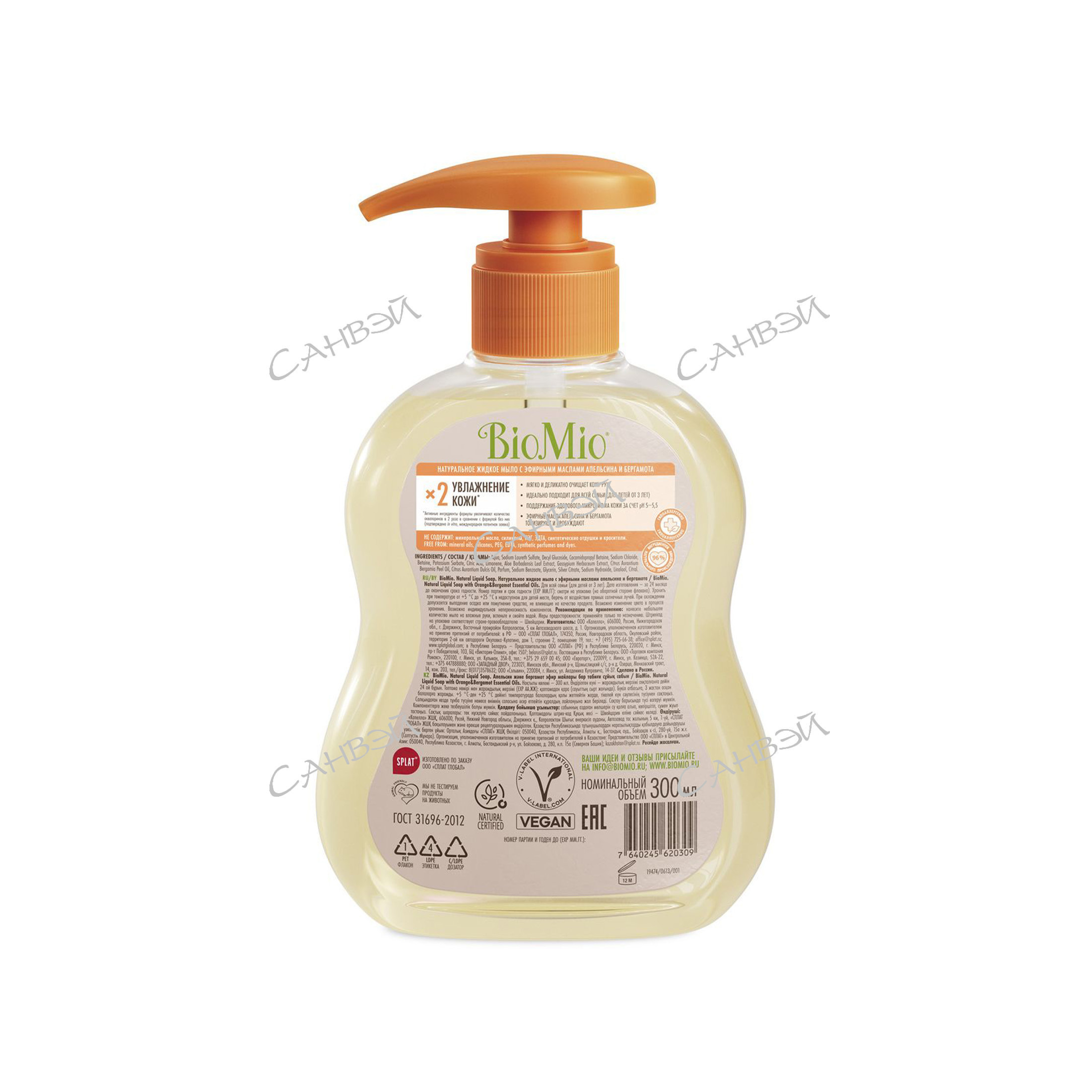 Гипоаллергенное натуральное жидкое мыло BioMio Natural Liquid Soap с эфирными маслами апельсина и бергамота, 300 мл на 96% состоит из компонентов природного происхождения. Цитрусовые ароматы поднимают настроение и заряжают энергией. Жидкое мыло для рук очищает и одновременно увлажняет кожу.