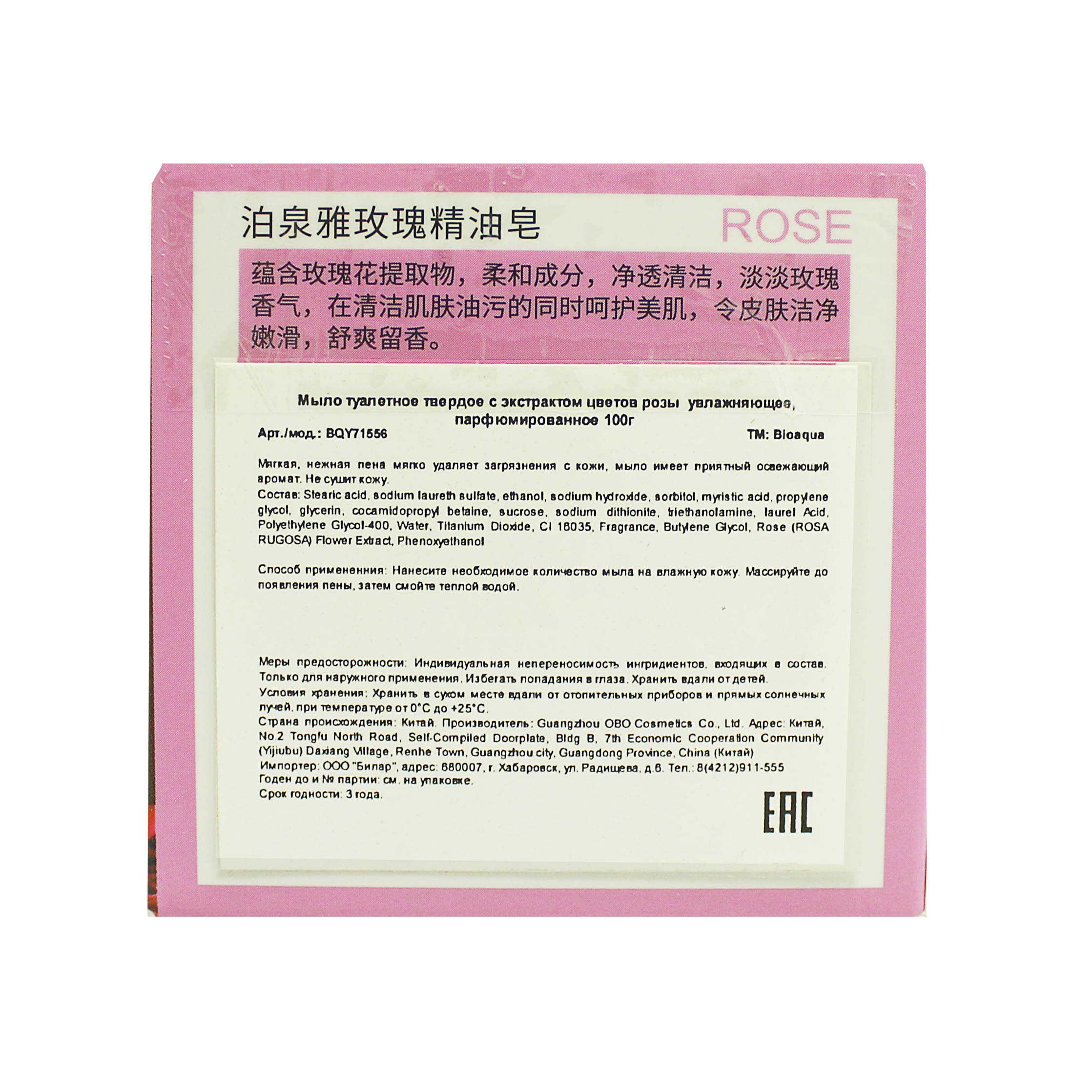 OBO Bioaqua мыло твердое 100 гр. увлажн.,очищ. д/в тип.кожи экст.розы карт./уп 1шт / 144шт / BQY71556 / 271556