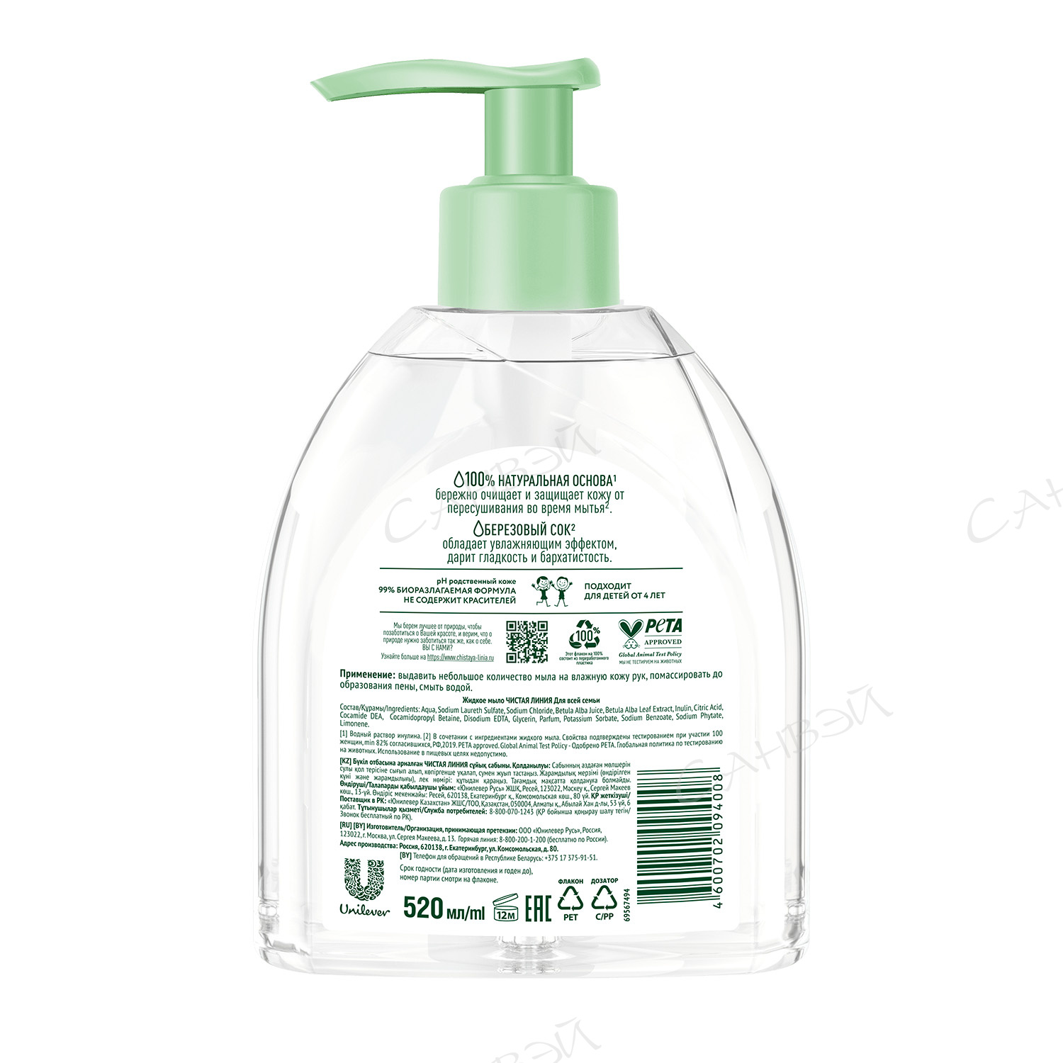 Чистая Линия Для всей семьи мыло жидкое 520мл очищ. д/в тип.кожи березов.сок флакон 1шт / 6шт / 1103715 / 094008