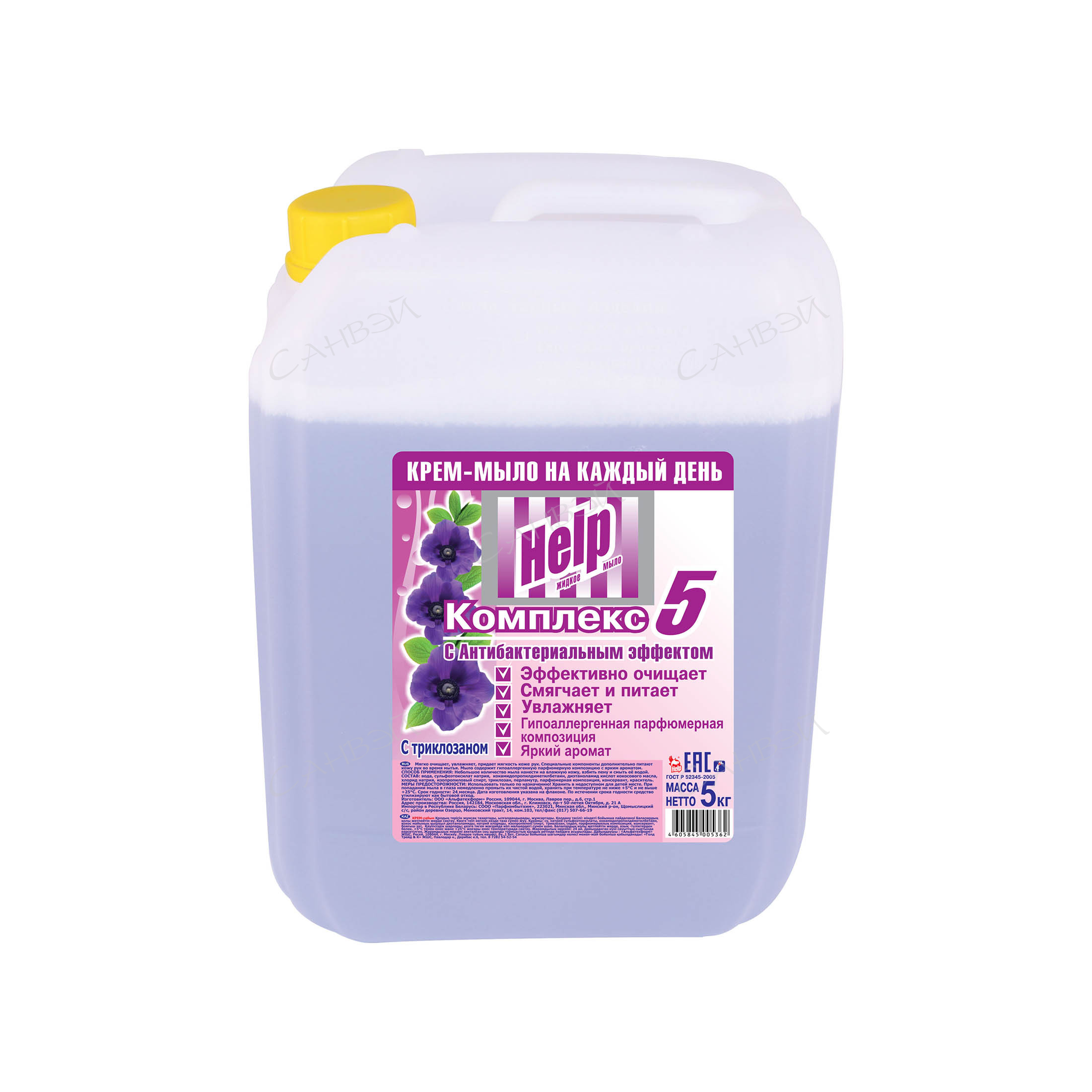 Help Жидкое крем-мыло Антибактериальное 5 л дает устойчивую высокую пену. Прекрасно смывает любые загрязнения, в том числе животный и растительный жиры, машинные масла. Удаляет неприятные запахи. Бережно ухаживает и увлажняет кожу рук. Обладает приятными естественными ароматами. Не требует большого расхода.