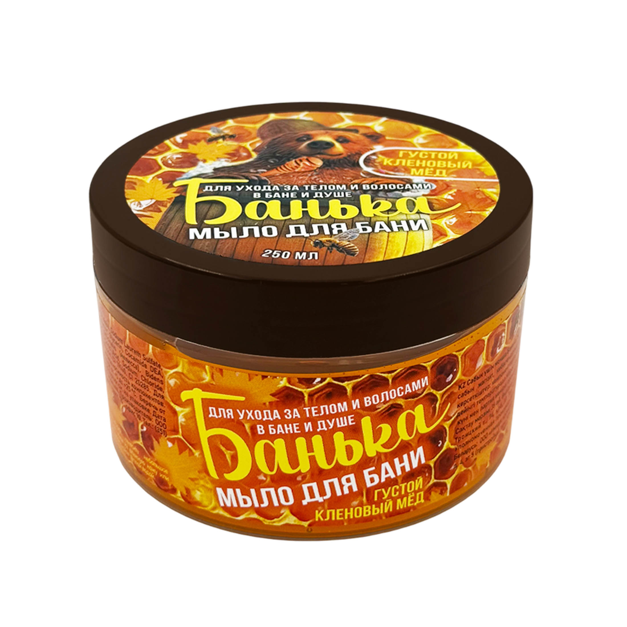 LK Жидкое мыло густое Банька Кленовый мёд 250 мл - натуральное средство для глубокого очищения и бережного ухода за кожей во время банных процедур. Благодаря насыщенной текстуре и натуральным ингредиентам мыло нежно очищает, питает и увлажняет кожу, оставляя её мягкой и шелковистой. Кленовый мед в составе обладает мощными антисептическими и смягчающими свойствами, способствует восстановлению кожи и придаёт ей здоровое сияние. Тёплый, натуральный аромат мёда создаёт атмосферу уюта и расслабления. Натуральное мыло подходит для использования в парной, сауне и в душе.