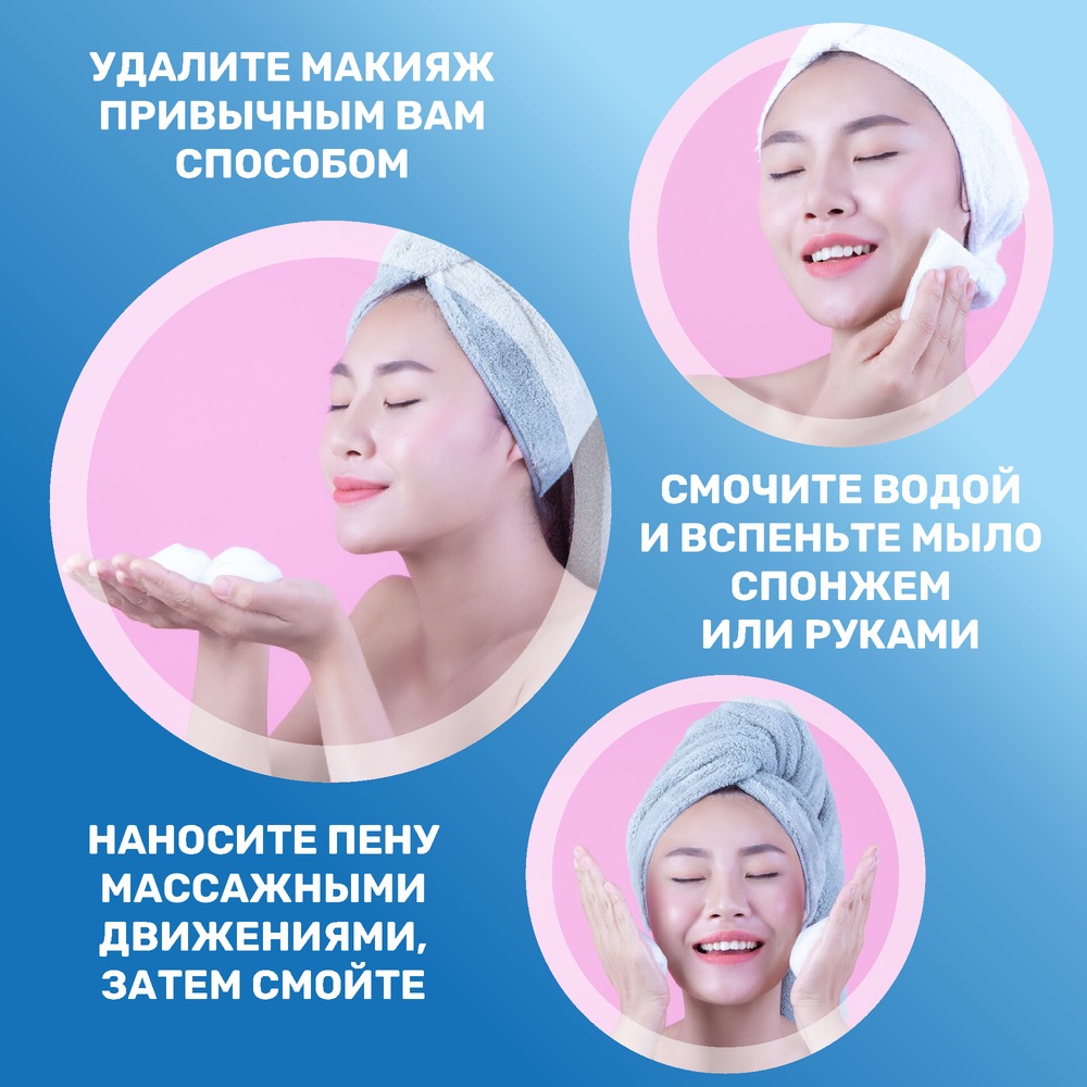 Намочите, затем натрите достаточное количество пены и промойте тщательно лицо, смойте обильным количеством воды