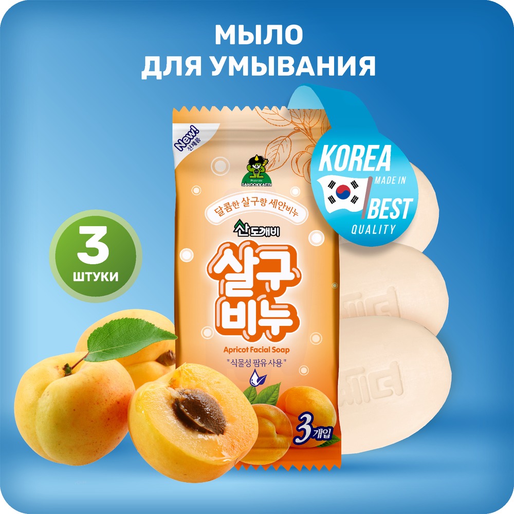 Твёрдое туалетное мыло для мытья лица, в котором используется растительное пальмовое масло для создания густой, мягкой пены, которая тщательно очищает кожу от загрязнений. Страна-изготовитель: Южная Корея. SANDOKKAEBI Косметическое туалетное мыло для лица на основе плодов масличной пальмы с ароматом абрикоса, 3 шт