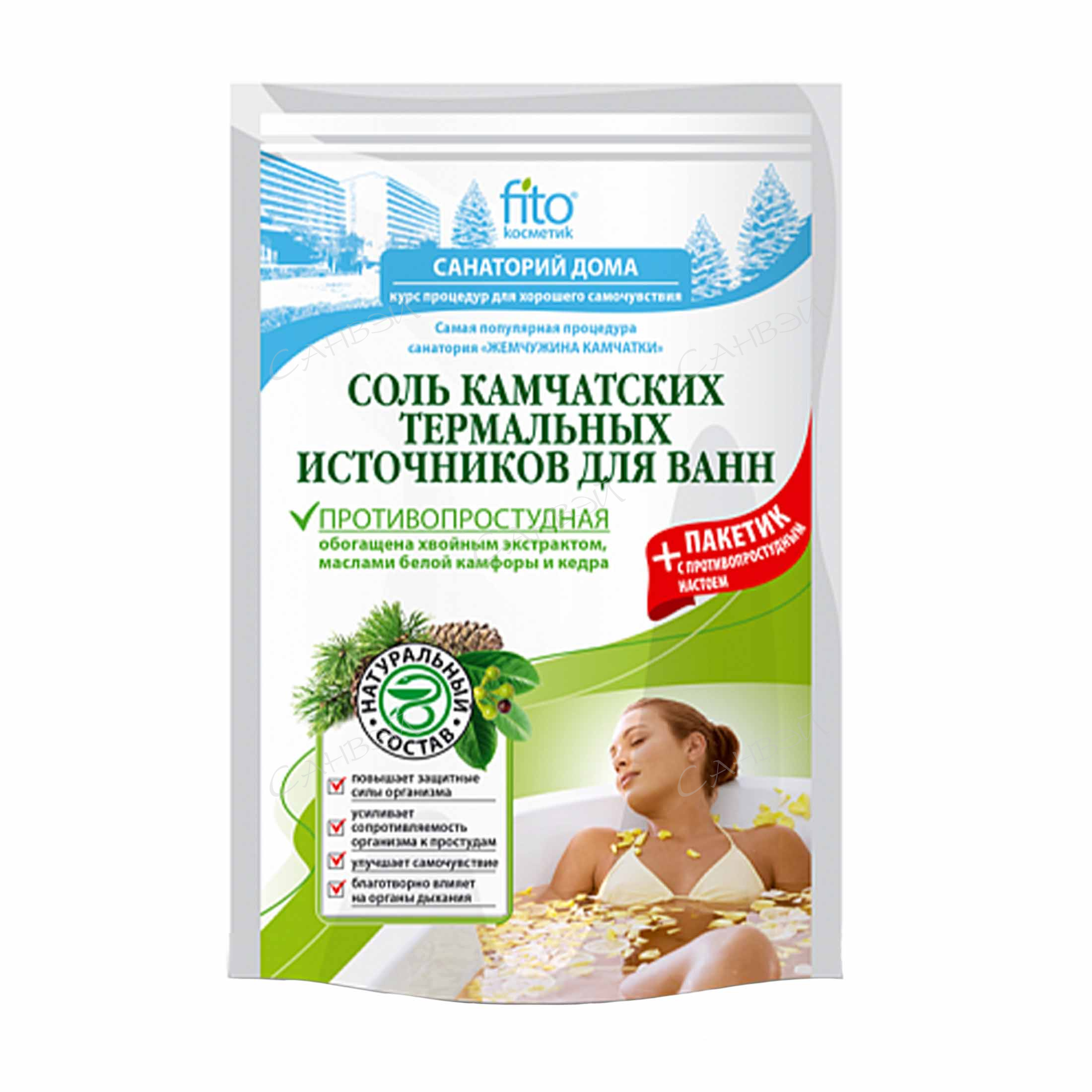Санаторий дома Соль для ванн Камчатских термальных источников Противопростудная 530 г насыщает воду редкими минералами и микроэлементами, превращая ее в настоящий термальный источник.