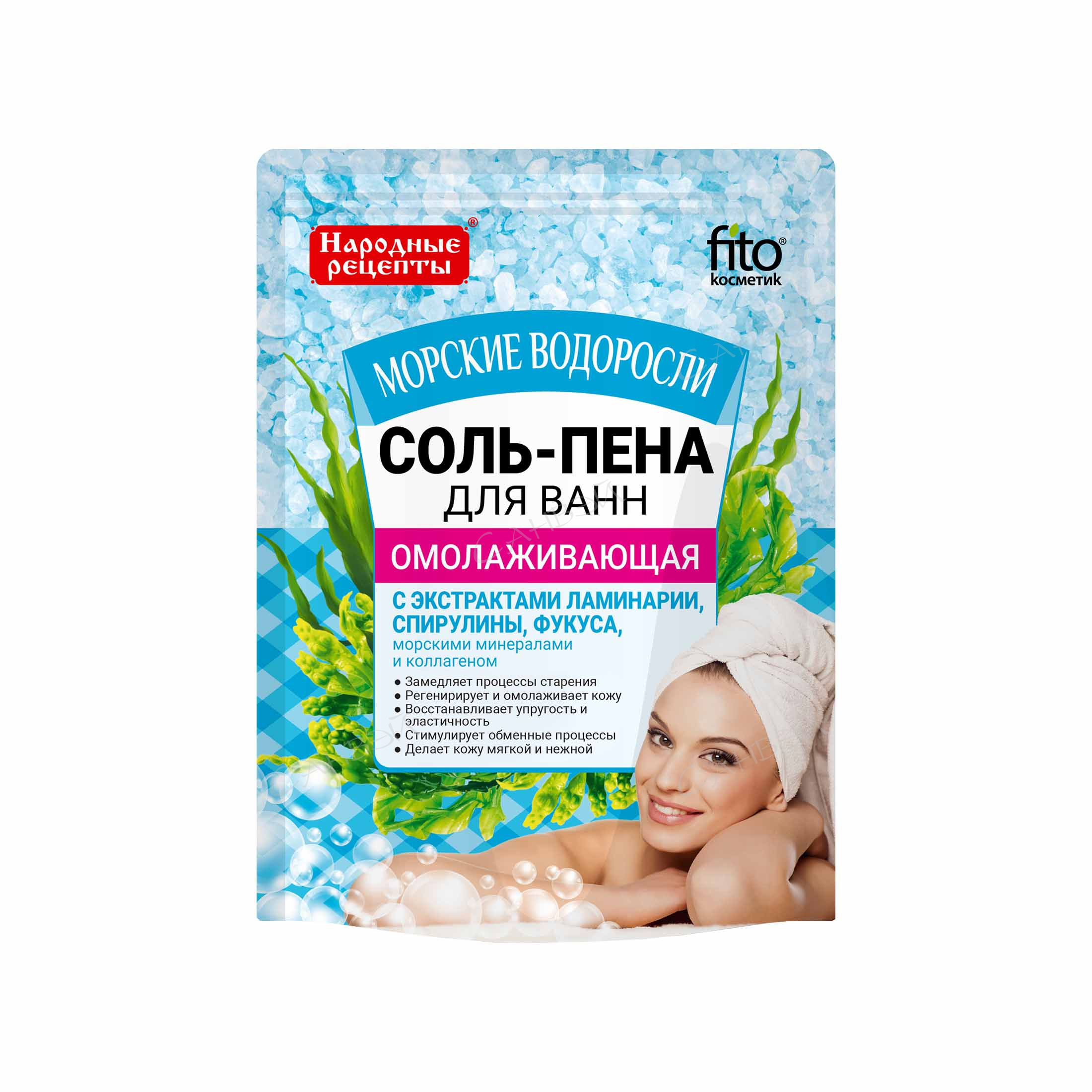 Народные Рецепты Соль-пена для ванн Омолаживающая Морские водоросли 200 г на основе натуральных, проверенных временем компонентов - это волшебная купель красоты, молодости, здоровья и долголетия. Соль-пена с экстрактами морских водорослей обладает эффектом лифтинга, ускоряет восстановление и омоложение всех слоев эпидермиса, замедляет процессы старения кожи, стимулирует выработку коллагена, эластина и гиалуроновой кислоты, улучшает обмен веществ, усиливает регенерацию, освежает кожу, делает ее гладкой, нежной и красивой. Легкая воздушная пена превратит принятие ванны в очаровательную расслабляющую процедуру.