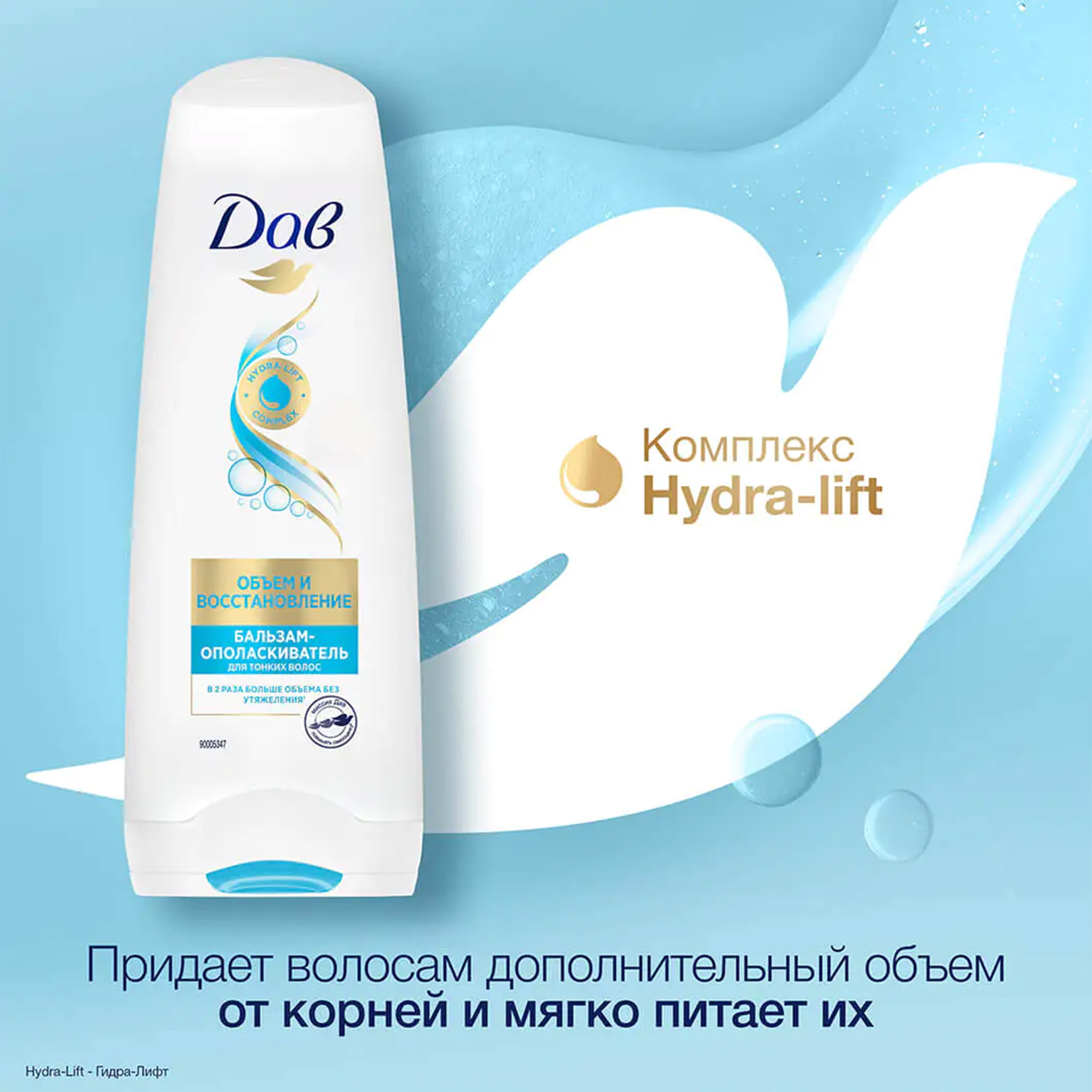 Бальзам-ополаскиватель Дав Объем и восстановление 200 мл без утяжеления с комплексом Hydra-Lift обеспечивает необходимый уровень питания и дополнительного увлажнения для тонких, безжизненных волос. Легкая формула придает волосам великолепную гладкость и плотный подвижный объем.