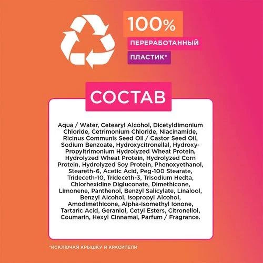 Aqua / Water, Cetearyl Alcohol, Dicetyldimonium Chloride, Cetrimonium Chloride, Niacinamide, Ricinus Communis Seed Oil / Castor Seed Oil, Sodium Benzoate, Hydroxycitronellal, Hydroxy- Propyltrimonium Hydrolyzed Wheat Protein, Hydrolyzed Wheat Protein, Hydrolyzed Corn Protein, Hydrolyzed Soy Protein, Phenoxyethanol, Steareth-6, Acetic Acid, Peg-100 Stearate, Trideceth-10, Trideceth-3, Trisodium Hedta, Chlorhexidine Digluconate, Dimethicone, Limonene, Panthenol, Benzyl Salicylate, Linalool, Benzyl Alcohol, Isopropyl Alcohol, Amodimethicone, Alpha-isomethyl Ionone, Tartaric Acid, Geraniol, Cetyl Esters, Citronellol, Coumarin, Hexyl Cinnamal, Parfum / Fragrance.